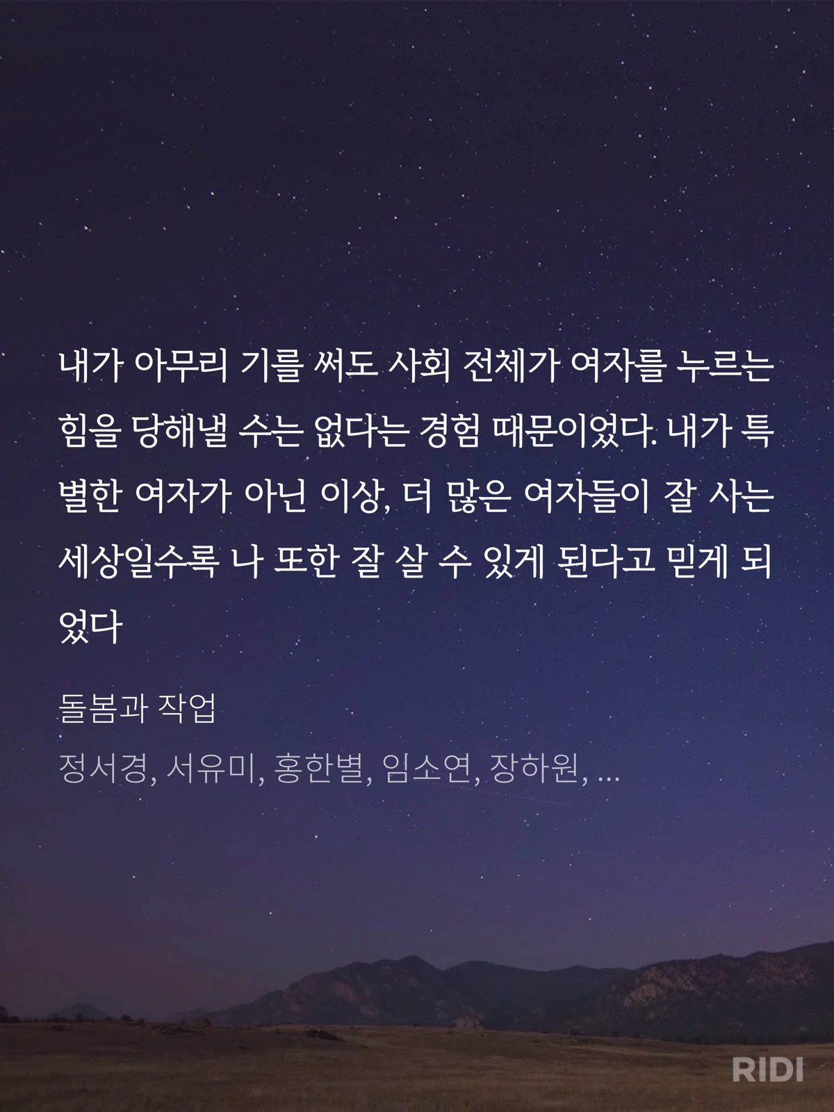 리디북스에서 대여 이벤트를 하길래 호로록 빌려서 반나절만에 읽을 정도로 흡인력이 있던 책이었다. 신기한 일이지만 이 책을 읽고 나서 나도 빨리 아이를 갖고 싶다는 생각을 하게 됐다. 나도 양육, 돌봄, 커리어 다 챙길 수 있어, 하는 이상한 자신감이 샘솟았달까. 같은 책을 읽은 다른 친구는 반대로 자기는 아이 낳아 기를 엄두가 더 안 나게 됐다고 혀를 내두르었지만. 역시 같은 책이어도 사람마다 감상이 다르다는 것도 재미나다.