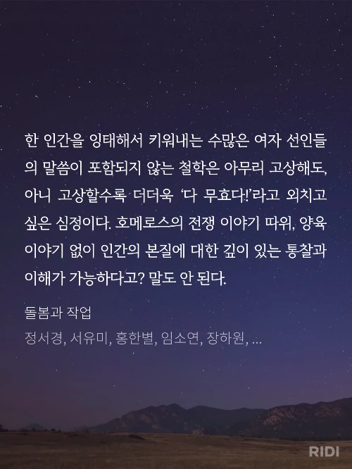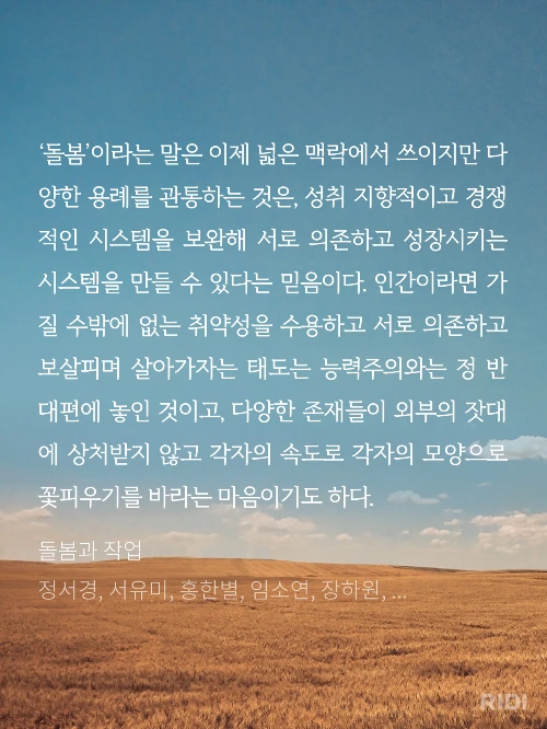 P. 110. 아이를 돌보는 일상에 대한 이야기가 더 많이 쌓이고 아이라는 낯선 존재를 어떻게 돌봐야 할지 함께 고민하는 사람이 늘어날 때, 양육의 무게는 조금 가벼워지고 돌봄의 분배는 조금 더 정의로워질 것이다.