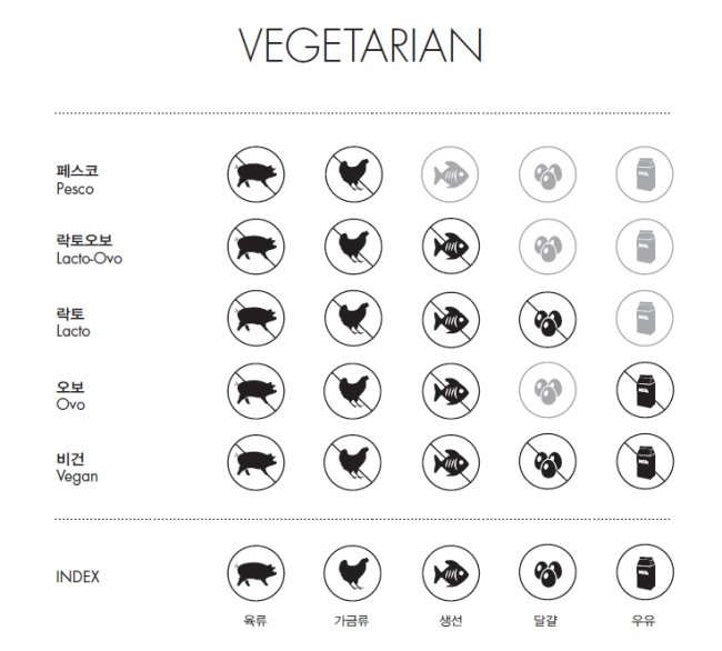 채식주의에는 몇 가지 단계가 존재하는데, 아래 표와 같이 도식화할 수 있다.