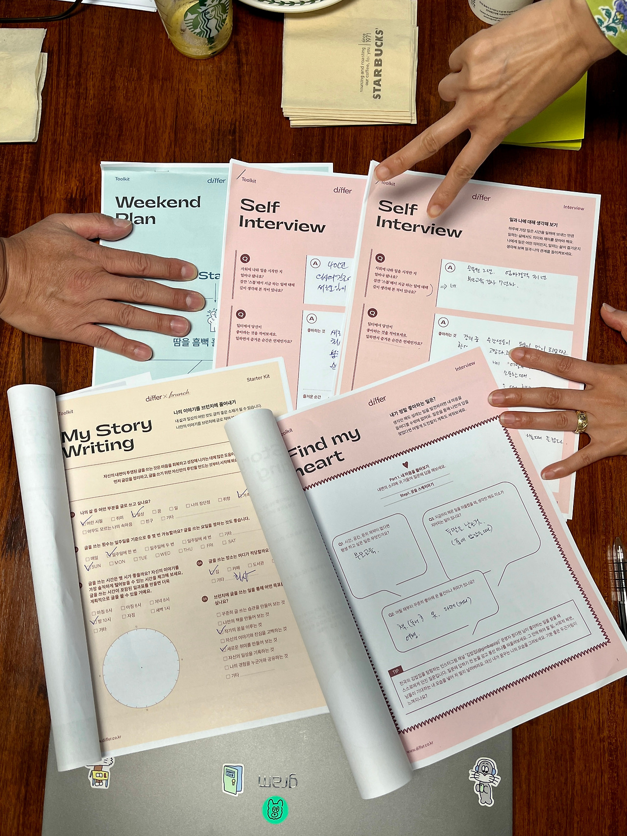 정식 첫 수업에 앞서 엄마와 아빠가 글을 쓰는 일을 통해 어떤 목표를 이루고 싶은지, 각자의 삶에서 어떤 것을 주제로 글을 써보고 싶은지, 좋아하는 취미나 물건은 무엇인지 등등이 궁금해서 OT를 진행했다. 먼저 아카이빙 해두었던 디퍼(differ)의 툴킷(tool kit) 폴더를 열어보았다. 디퍼는 성장을 만드는 질문을 하고 저마다의 답을 수집하는 미디어 서비스인데, 갖가지 툴킷을 무료로 다운받아 사용할 수 있다. 전문적이기보다는 흥미로운 주제들로 구성되어 있으며 툴킷도 3장을 넘지 않아 가볍게 사용해 보기 좋다. 디퍼에서 언젠가 사용해 보고픈 툴킷을 20개쯤 아카이빙 해놓아서 글쓰기 수업 OT에서 쓰기 좋은 3가지 정도를 골랐다.