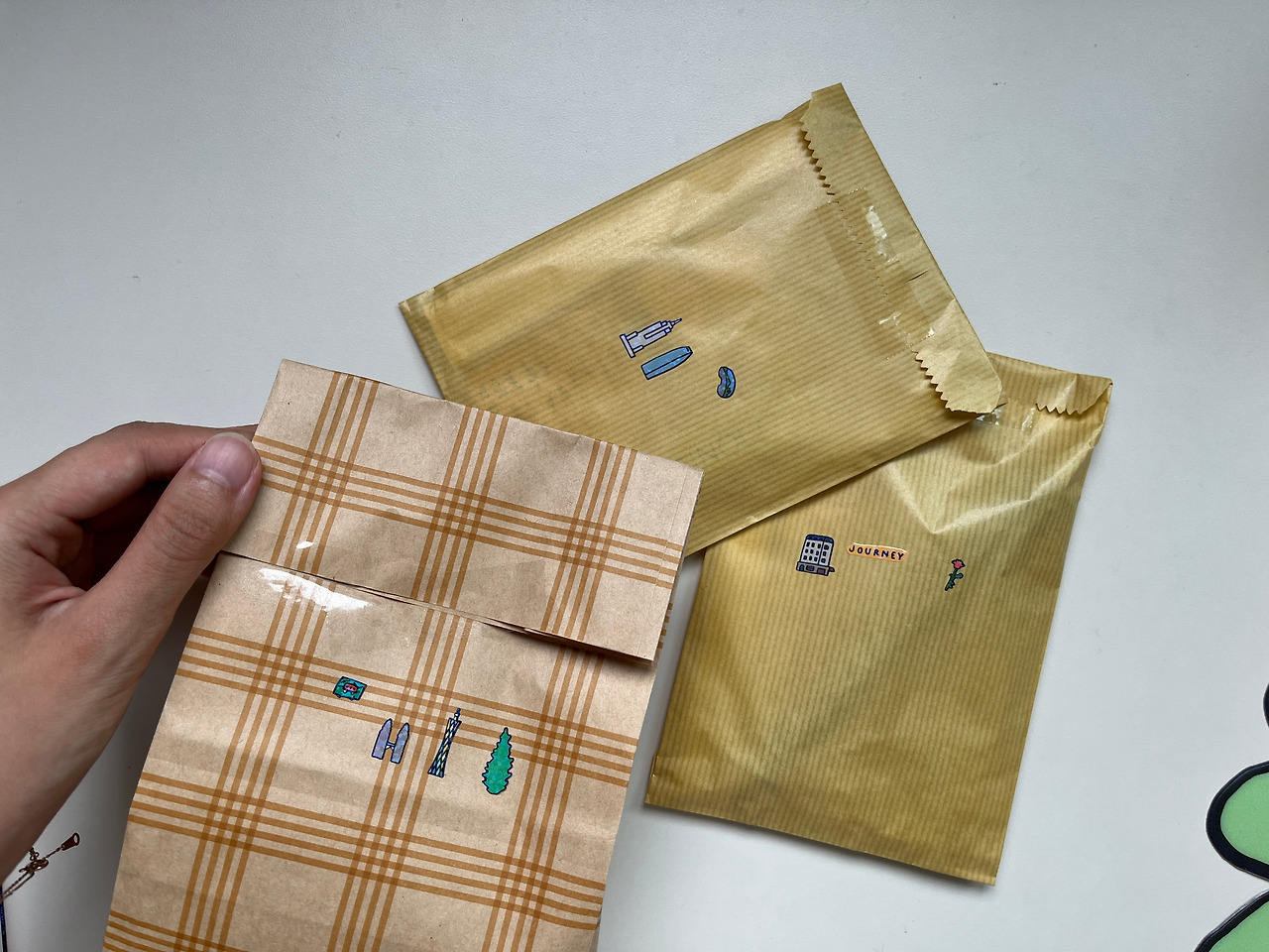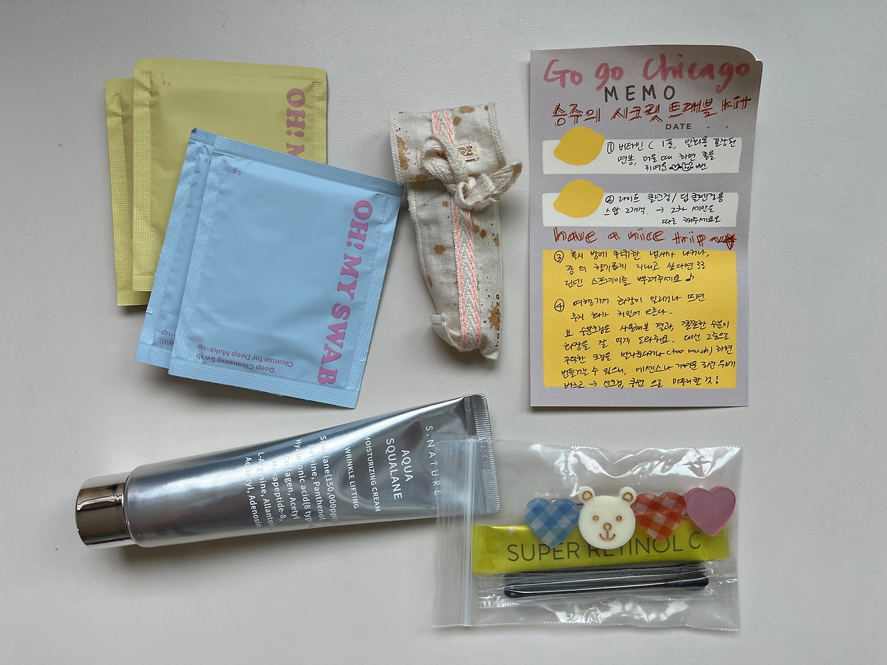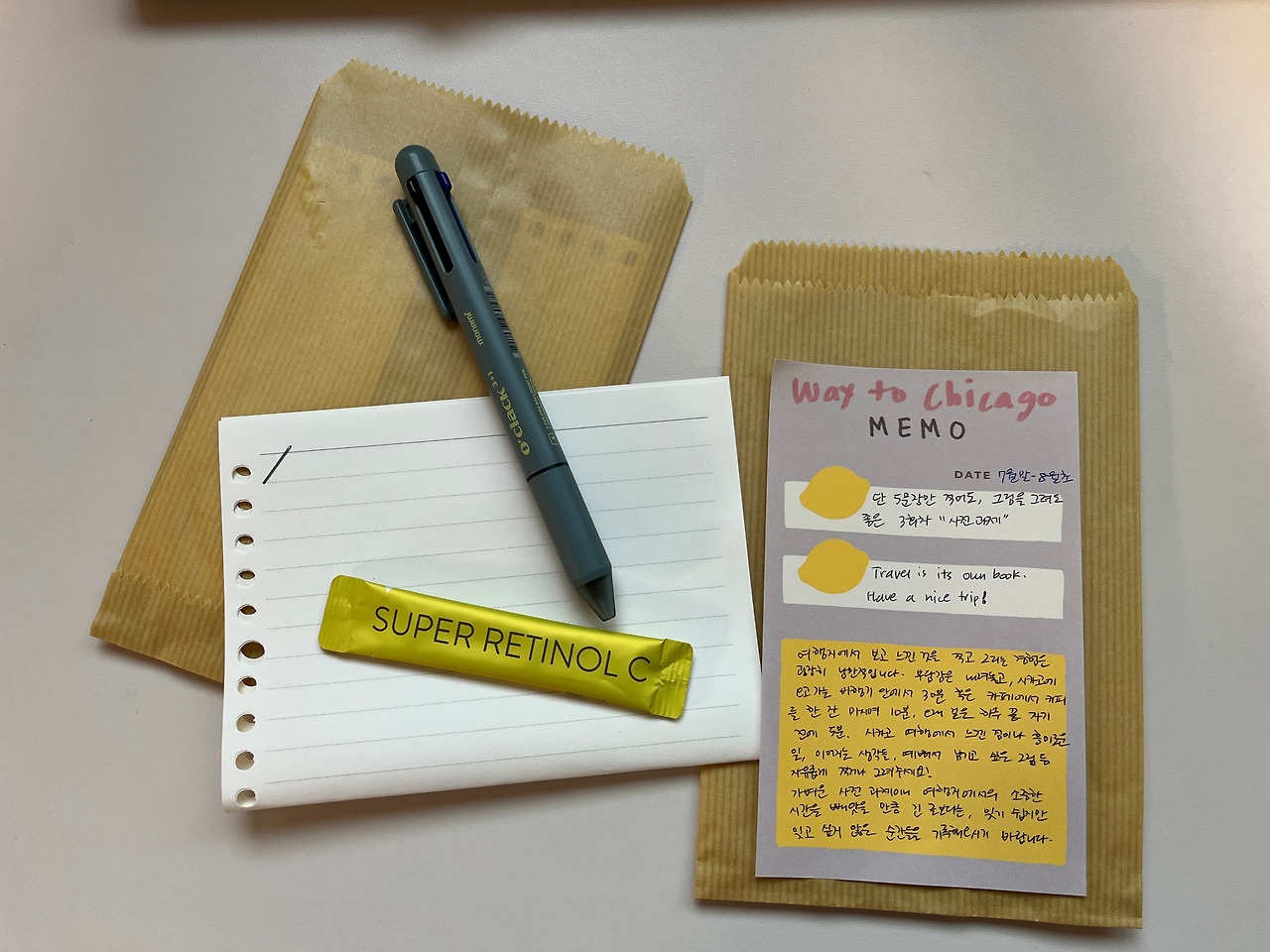 시카고 여행을 가기 전, 비행기에서 자그만 두근거림을 느끼길 바라며 가족들에게 귀여운 꾸러미를 선물했다. 아빠와 엄마의 꾸러미는 선물보다는 미니 글쓰기 과제였기 때문에 펜과 종이 등이 담겼지만, 언니에게는 여행에 필요한 나름의 센스있는 아이템들을 담아보았다.