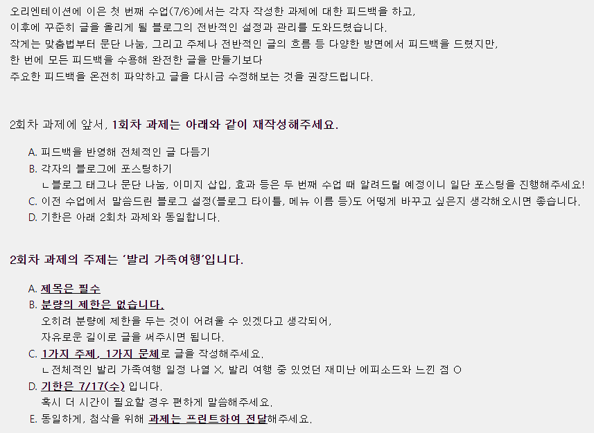 하지만 내가 피드백을 해주는 글이 절대로 정답일 수는 없기에, 각자의 스타일을 살리면서도 글에 드러나는 아쉬운 습관들만 조금씩 줄여가는 방식으로 수업을 진행하고 있다.