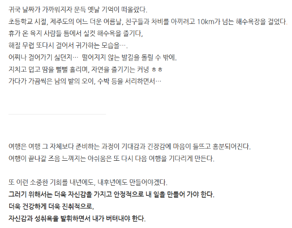 '20대 때 무의촌 공보의에게 지급된 125cc 오토바이를 타보고는~' 정말 아빠만이 말할 수 있는 경험이 이런 것이 아닐까? 이런 이야기는 아빠의 시선과 기억이 녹아 있는 부분이라, 글의 개성이 살아나고 읽는 사람에게도 호기심을 불러일으킬 수 있다. 잘 모르는 사람이 보더라도, 저것이 어떤 경험인지 아빠의 과거에 대한 호기심이 동할 것 같다.