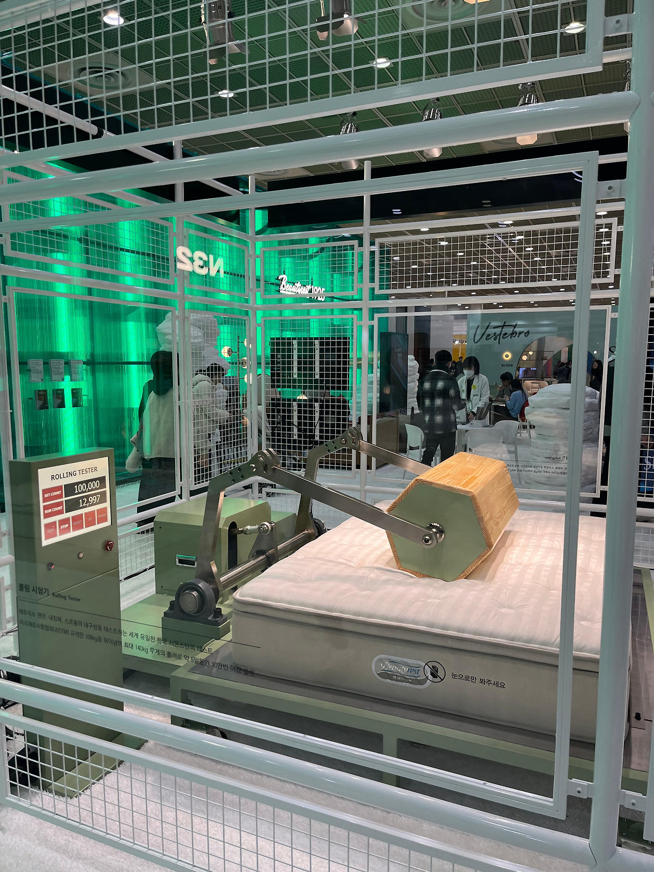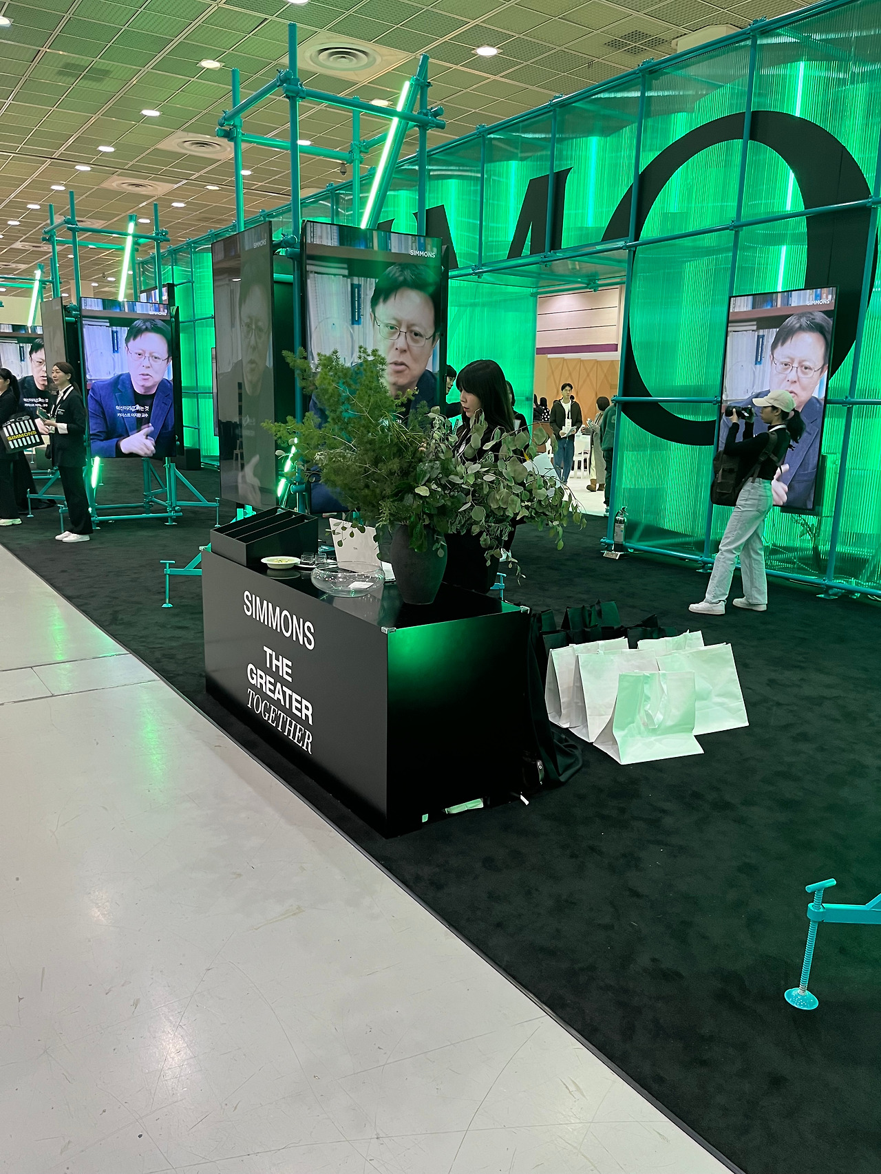 시몬스와 코웨이는 대기업인만큼 가장 큰 전시 공간을 차지한다. 시몬스는 초록빛의 네온 컬러가 적용된 반투명 아크릴 소재를 활용한 거대 가벽을 철제 프레임과 함께 배치했고, 전체적으로 연구실 콘셉트로 브랜드의 '침대는 과학이다'라는 메시지를 전달하고자 하는 듯하였다. 스텝들의 의상 역시 흰 가운으로 맞추었고, 실시간으로 작동하는 매트리스 롤링 테스트기를 배치해 젠틀 몬스터의 실험적인 전시와 같은 느낌도 받았다.