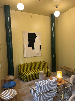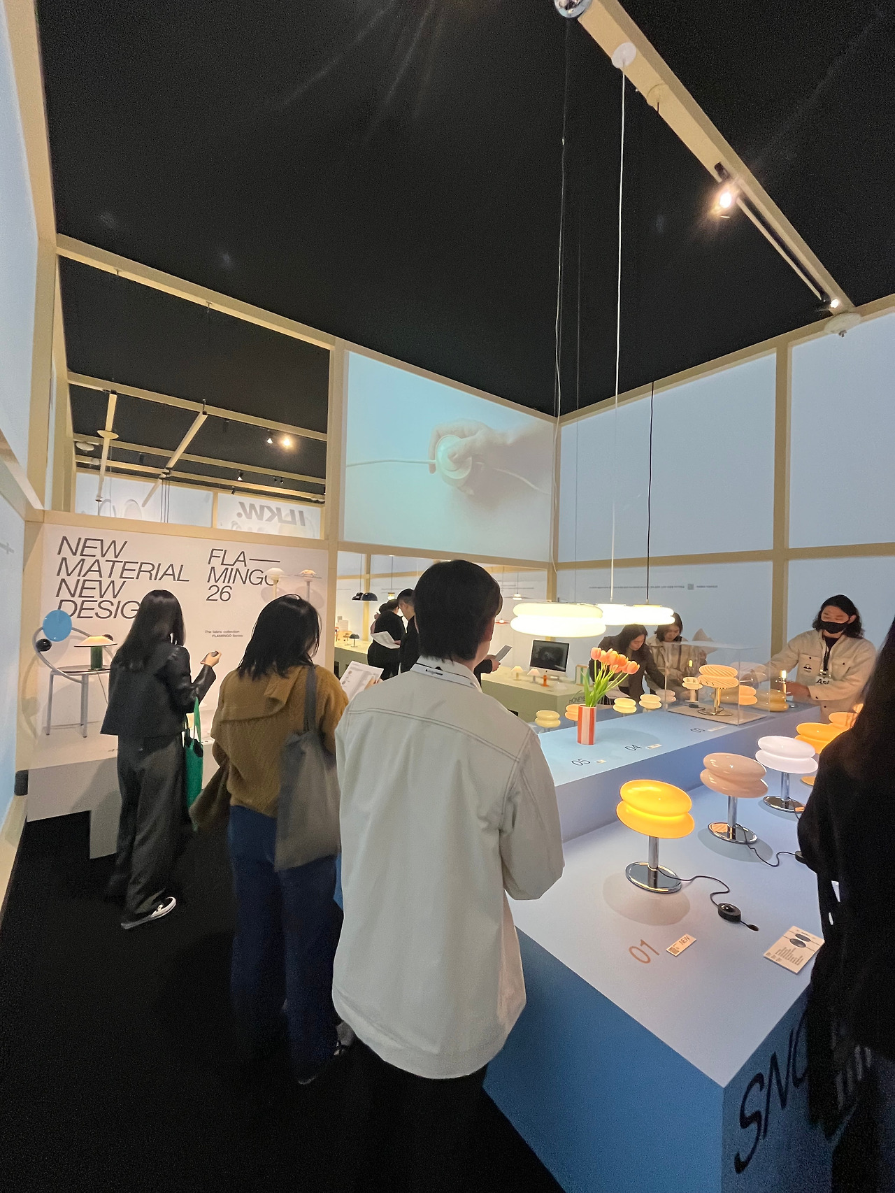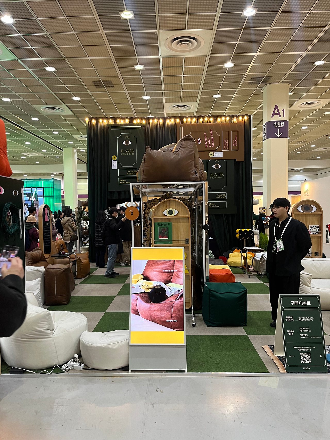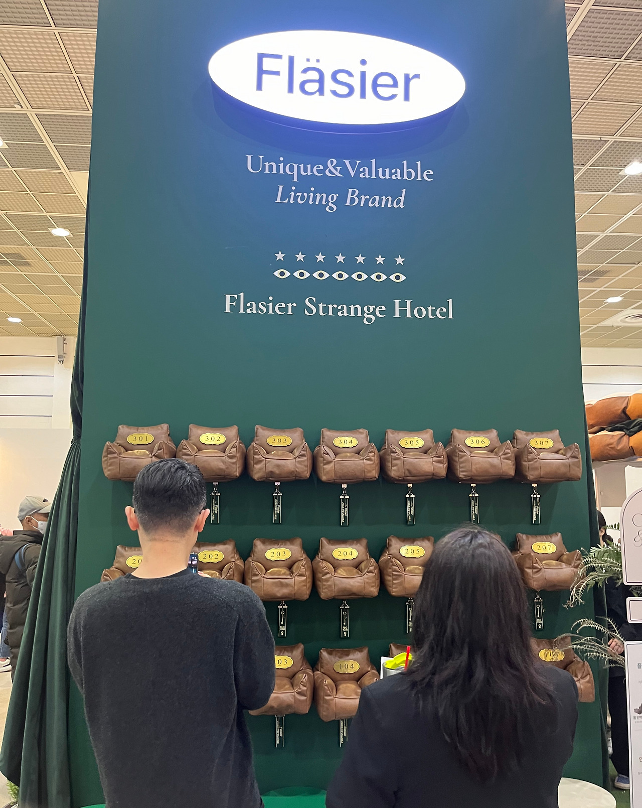 멀리서부터 호기심을 자극하는 커튼으로 뒤덮인 대형 구조물이 있어 발길이 이끌린 곳은 1인 소파 브랜드 플레시어의 빈백을 전시한 부스였다. 양쪽 벽면엔 미니 빈백과 열쇠를 묶어 컨시어지로 구성한 공간이 여러 컬러로 구성되어 있어 디테일을 엿볼 수 있었고, 공간 전체에 호텔 콘셉트에 맞게 재미있는 볼거리들을 구성해 두어 가장 사람들이 많이 몰리는 부스 중 하나였다.