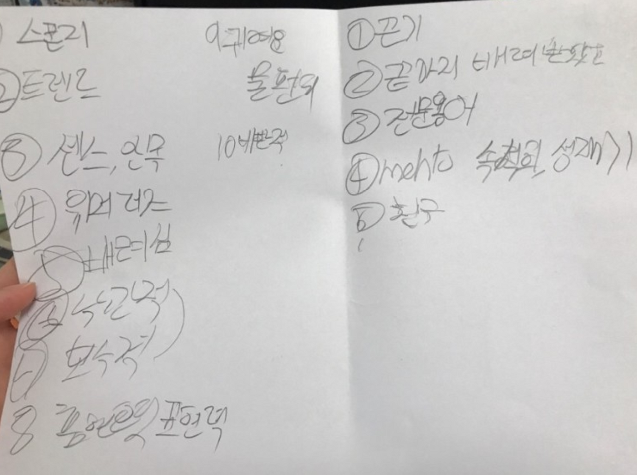 끝나고 오늘 쓴 종이를 옆에 붙여놓으려고 하는데 잠깐만요 라고하며 마지막으로 갖고 싶은 것이 있다고 종이를 가져갔다.