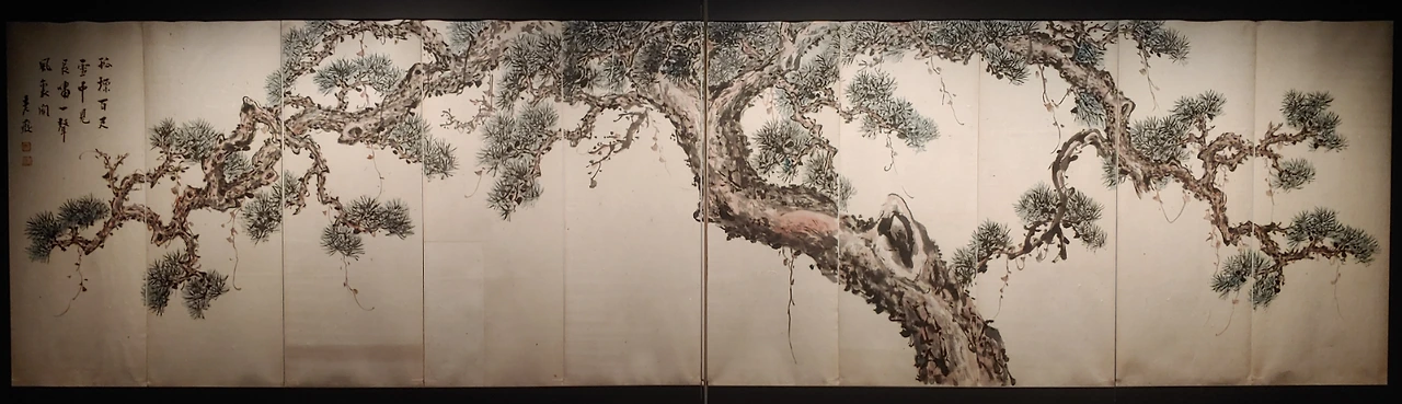 대중에게 최초로 공개되는 작품입니다. 마치 병풍처럼 종이 열 폭에 소나무 한 그루를 파노라마처럼 펼쳐놓은 보기 드문 대작이죠. 크기만 압도적인 것이 아니라 잎과 가지를 섬세하게 표현해놓은 솜씨도 아주 일품입니다. 위아래를 과감하게 잘라낸 구도에서는 현대적인 감각마저 느껴집니다. 소치가 노년기에 완숙한 기량을 유감없이 풀어낸 작품으로 평가됩니다. 화폭의 왼쪽 위에 소치가 직접 쓴 글씨의 내용은 이렇습니다.