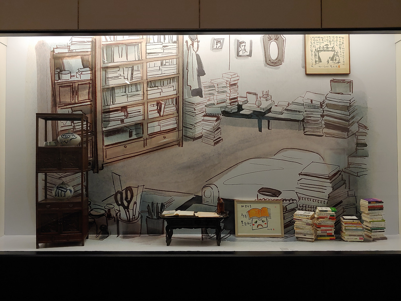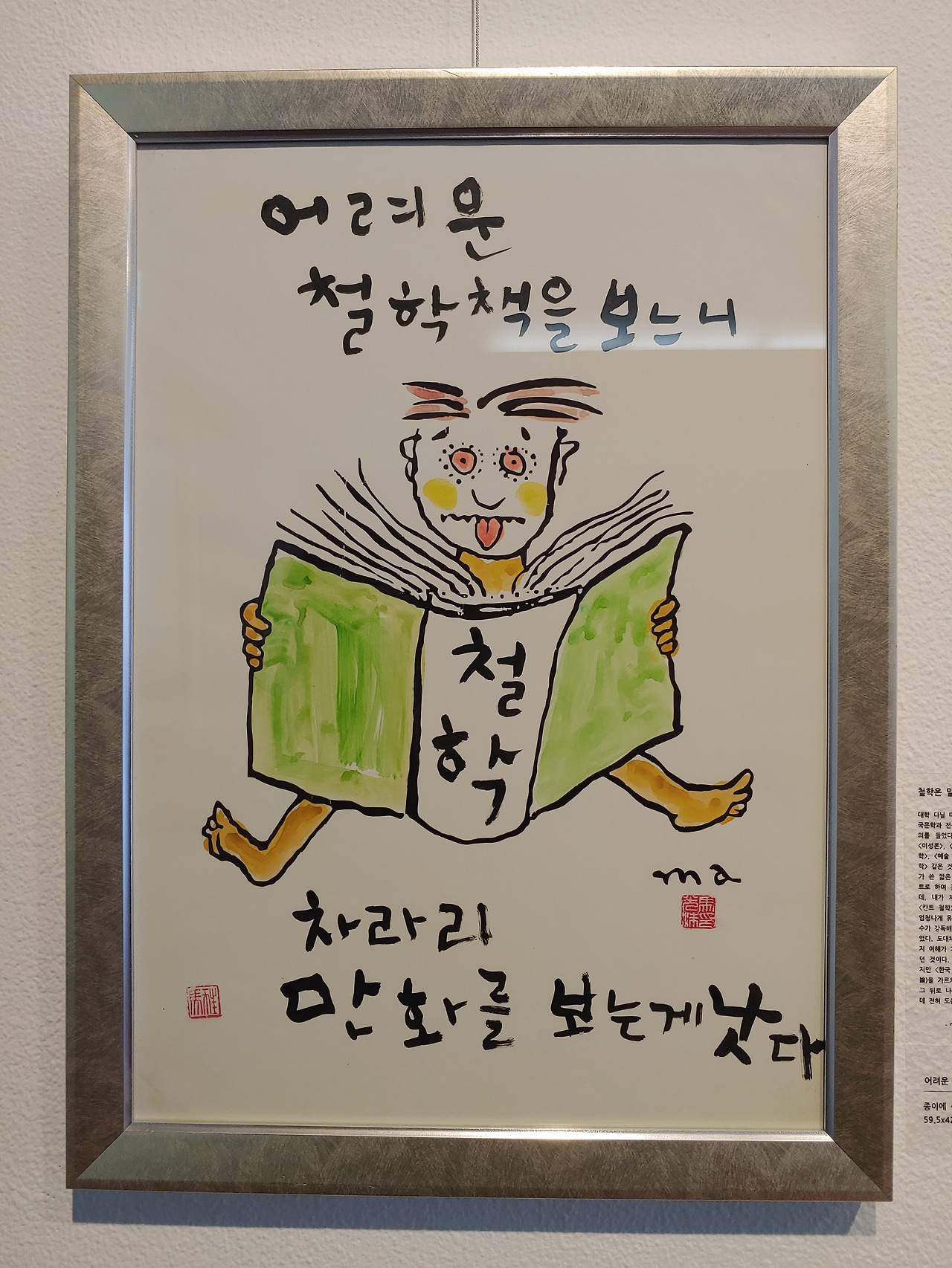 마 교수 그림의 가장 큰 특징은 글과 짝을 이룬다는 점입니다. 마 교수가 발표한 시나 소설의 상당수는 같은 제목의 그림으로도 꽤 많이 남아 있습니다. 그래서 전시장에 가면 그림과 책을 나란히 선보이는 공간이 여럿 있습니다. 전시장 입구에 인쇄된 마 교수의 글을 읽어 보면 시(詩), 글씨(書), 그림(畵)을 일치시킨 옛 문인들의 전통을 진지하게 의식하고 있었음을 알 수 있습니다.