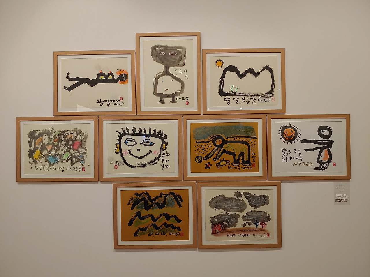 전시장에 걸린 그림들은 마 교수의 이 말에 정확하게 부합합니다. 머리를 쥐어 뜯어가며 구도를 잡고, 떨리는 손으로 세심하게 색을 고르고, 숨을 꾹 참아가며 선을 그어나가는 태도와는 거리가 멀죠. 마음 가는 대로, 손 가는 대로 쓱쓱 그려나간 그림들은 천진난만한 어린아이의 솜씨로 보아도 좋을 정도입니다.