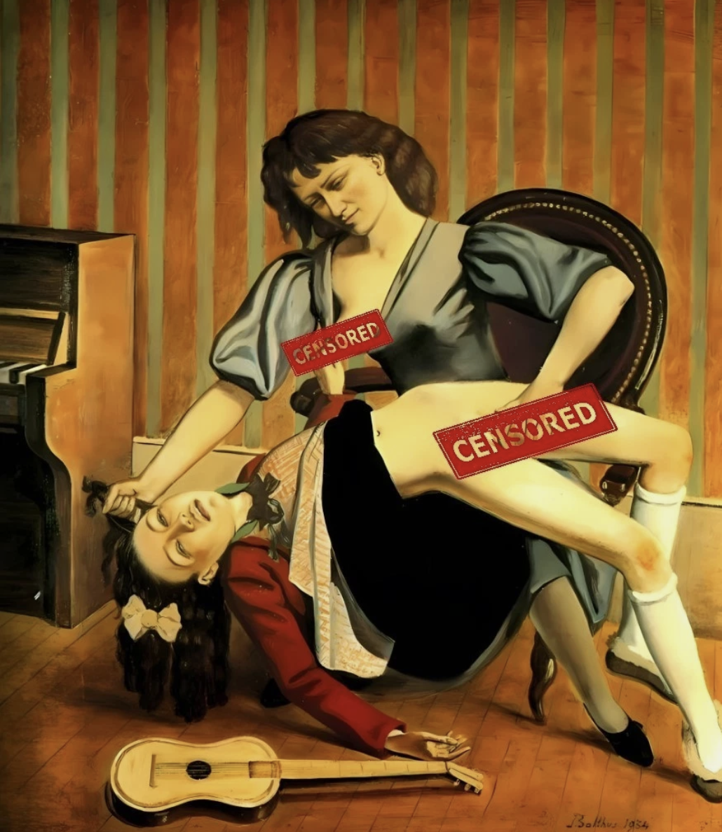 처음에 올린 원본 이미지를 다시 올리면 또 삭제될 것이 뻔하므로, 문제의 신체 부위가 가려진 이미지를 이베이(eBay)에서 빌려왔다. 나는 발튀스의 <기타 레슨>을 국내의 저명한 정신분석학자 백상현의 책 『악마의 미학』(현실문화, 2018) 109쪽에서 처음 봤다. 발튀스라는 화가의 그림은 눈에 보이는 것과 다른 심오한 주제 의식을 담고 있고, <기타 레슨> 또한 그런 맥락에서 하나의 예술 작품으로 진지하게 다뤄지는 게 마땅하다. 하지만 브런치의 게이트키핑 시스템이 글의 맥락까지 고려하지는 않았을 것이므로, 이 이미지가 브런치의 기준에 걸려 삭제된 건 나로서도 어쩔 수 없는 일이다. 원본 이미지는 인터넷에서 쉽게 찾을 수 있다.