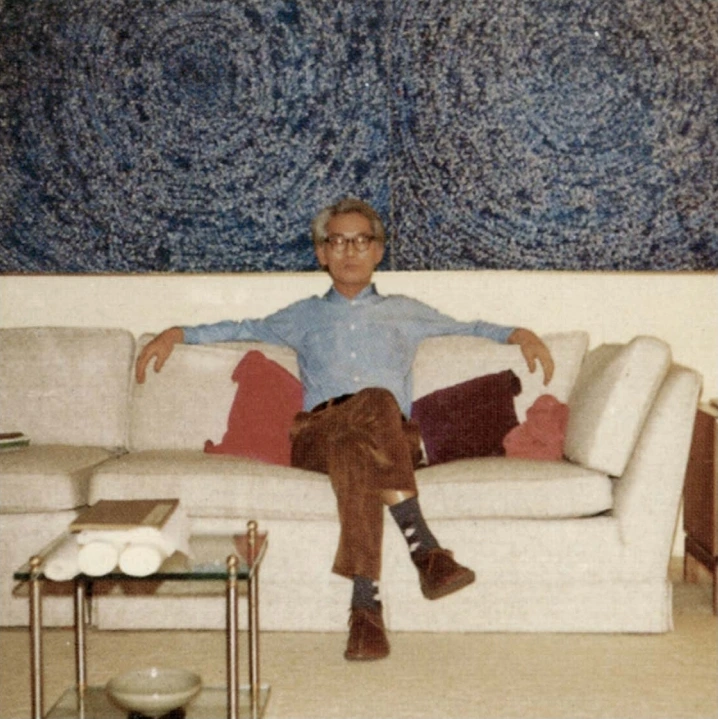 이 사진은 당시 저자의 거실에 걸린 작품 앞에 앉아 있는 김환기의 모습을 찍은 겁니다. 그런데 원작의 모습과는 조금 다르죠. 거실에 걸기엔 작품이 워낙 크다 보니 원형 무늬가 서로 머리를 맞대도록 패널을 옆으로 뉘어서 건 겁니다. 이 그림은 이후 2004년까지 30여 년 동안 김환기의 주치의이자 후원자였던 저자의 집 벽을 장식했습니다.