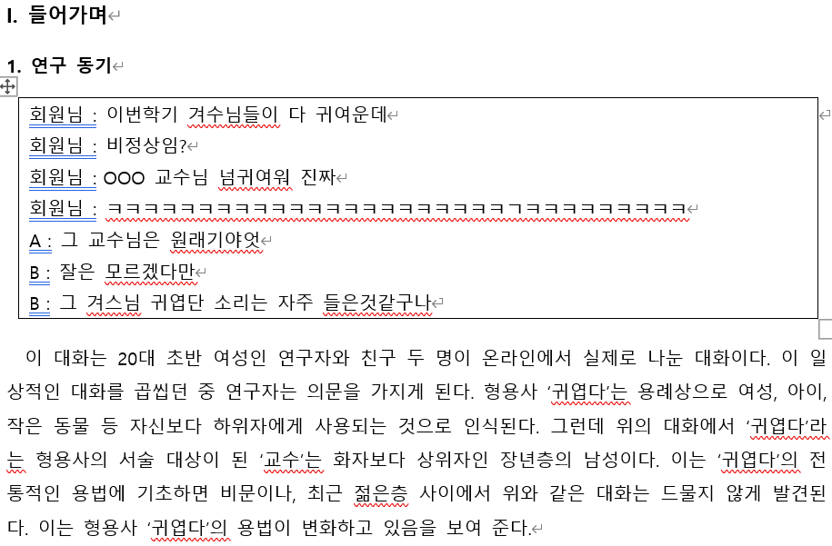 수업명은 ‘국어의미론’이었다. ‘한국어 의미에 관한 자유 주제’로 중간고사 대체 보고서를 쓰는 수업이었는데, 나는 ‘형용사 ‘귀엽다’의 의미 확장’에 대해 썼다. 하필 그 주제였던 이유는…… 내가 “국어의미론 수업 담당 교수님 귀여워”를 연발하고 있었기 때문이다, ‘귀엽다’는 원래 연장자에게 쓰는 말이 아님에도. 그것이 잘못된 언어 사용이 아니라 변화된 언어 사용이라고 주장하기 위해 보고서를 쓰기 시작했다.