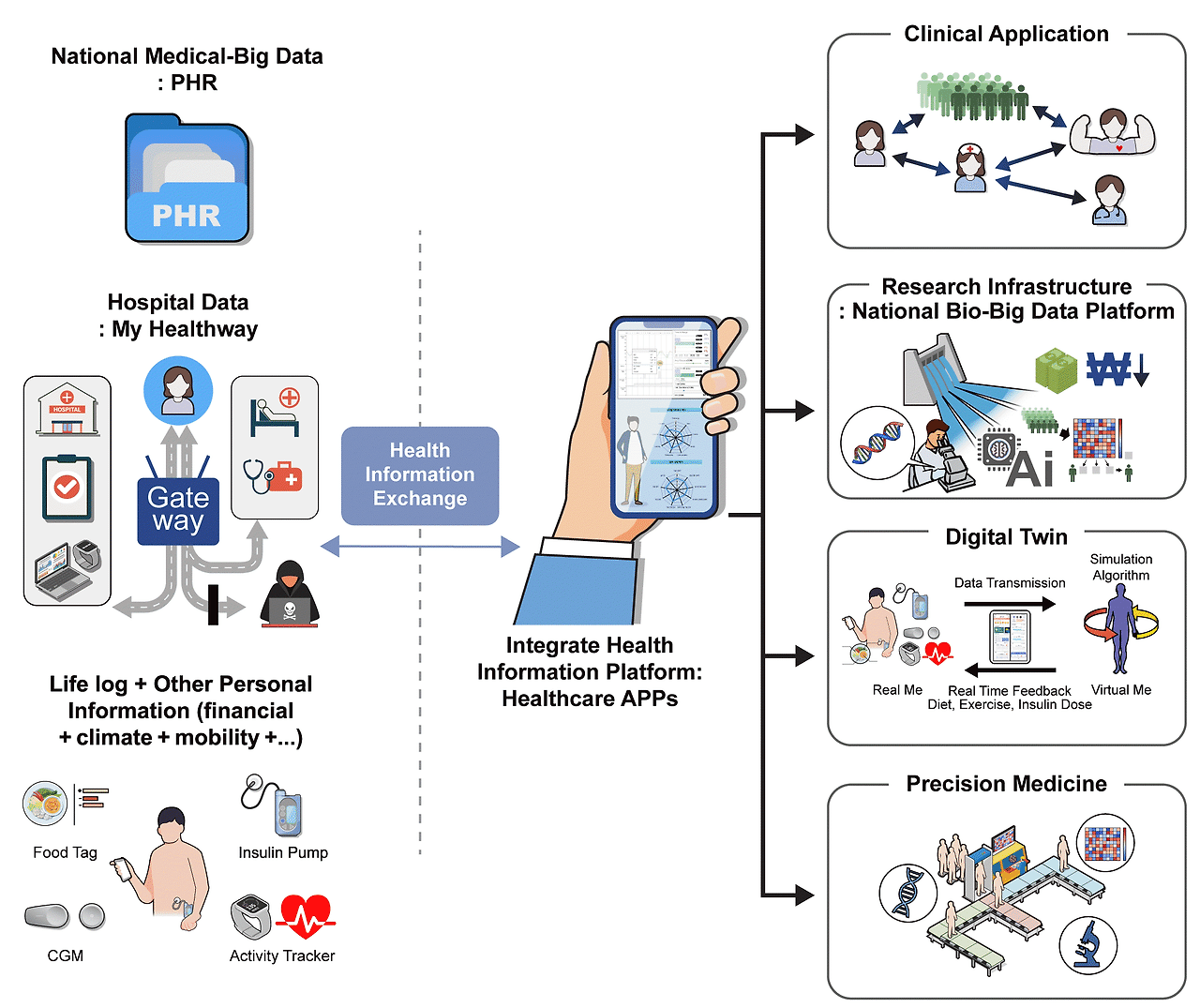 단일 기기나 앱이 아니라 여러 디바이스·서비스·기관이 연결된 구조가 강조됩니다. 데이터가 수집되고, 분석되고, 의료진/사용자/기관이 서로 액션을 취하는 흐름이 중요합니다. KCI