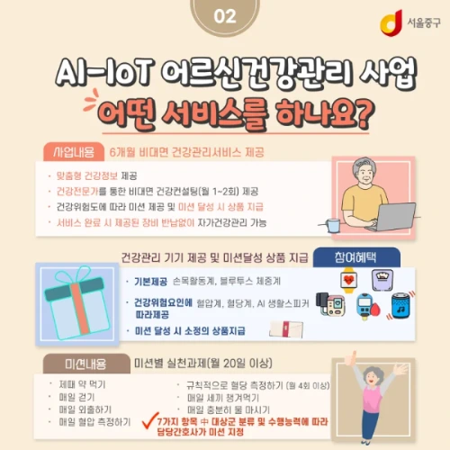 고령화 사회에서 고령자는 만성질환·기능제한·정신건강(우울) 등 복합적 건강 리스크를 안고 살아갑니다. 예컨대, 서울 중구보건소가 시행 중인 ‘AI·IoT 기반 어르신 건강관리 사업’은 만 65세 이상 스마트폰을 소지한 어르신 중 허약관리·건강습관개선이 필요한 이들을 대상으로 스마트기기(활동량계·체중계·혈압기·혈당계)를 제공하고 앱을 통한 실시간 모니터링과 맞춤형 미션을 운영합니다. junggu.seoul.kr
