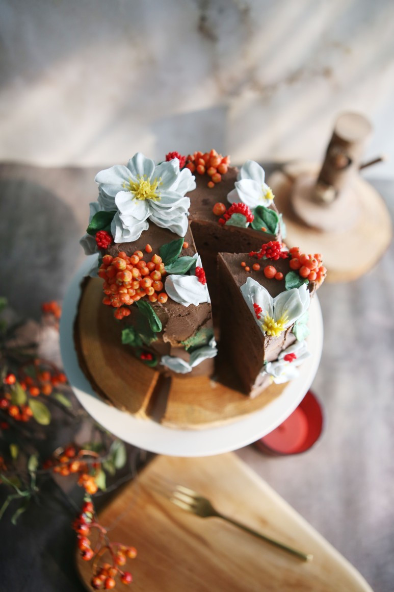 디자인은 크리스마스에 유명한 디저트 부쉬 드 노엘 통나무 롤케이크 표면을 플라워 케이크에 적용했다.