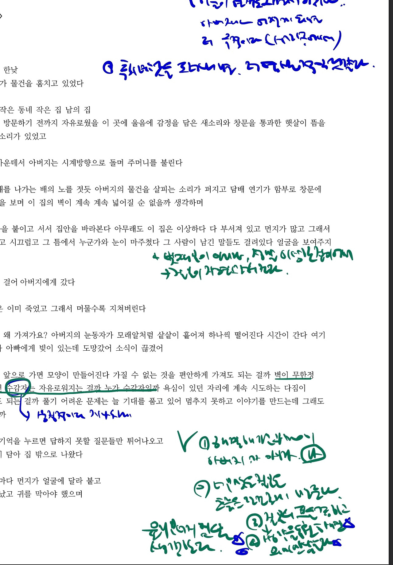 이번 합평에 가져간 시는 이것인데, 시에 대한 감상이 모두 달랐다. 나의 의도와도 확연하게 달랐고. 재밌는 경험이었다. 가족 윤리의 해체를 이야기하는 사람, 도둑질이 아니라 자신의 물건을 챙기는 것 이었다는 감상, 아버지가 아니라 사실 화자였다는 해석 등. 내가 감히 구성하고 구조화할 수 없었던 감상들이 있었다. 내가 시를 쓰는 과정에서 본 세계보다 더 넓기도 하고 동시에 줌인-줌아웃의 역동성까지. 시에 평가 이전에 이러한 감상 자체에서도 큰 배움이 있었다.