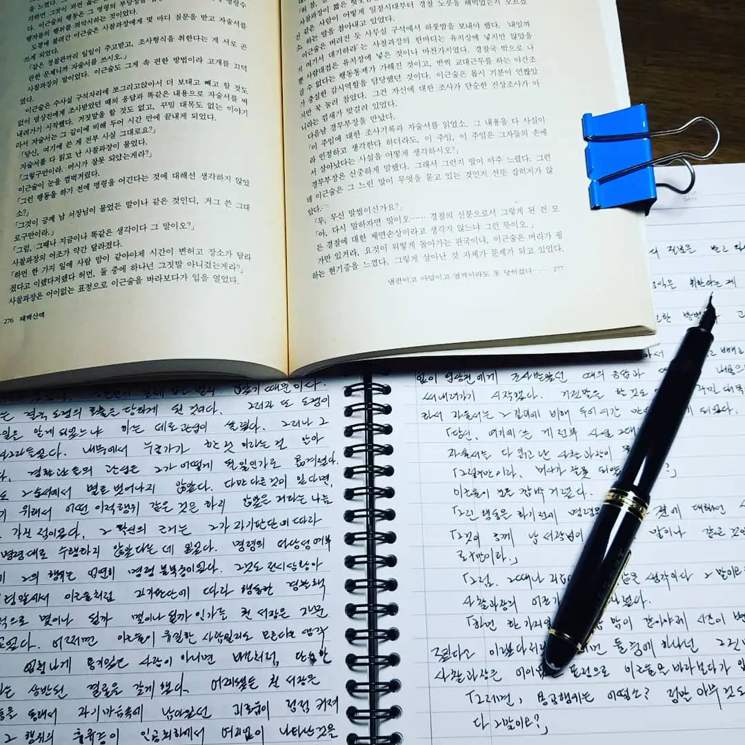 감았던 눈을 뜨고 만년필의 뚜껑을 열고 노트를 펼친다. 펼쳐진 노트에서 마지막 필사 한 곳을 찾아 만년필로 태백산맥 소설책의 내용을 그대로 옮겨 적는다. 종이에 만년필 촉이 미끄러져 나가는 사각사각 소리가 이문세 님의 '옛사랑'이라는 노래와 너무 잘 어울린다.