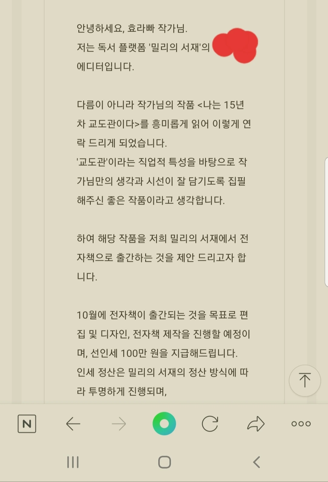 "안녕하세요. 효라빠 작가님 저는 독서 플랫폼 '밀리의 서재'의 000 에디터입니다."