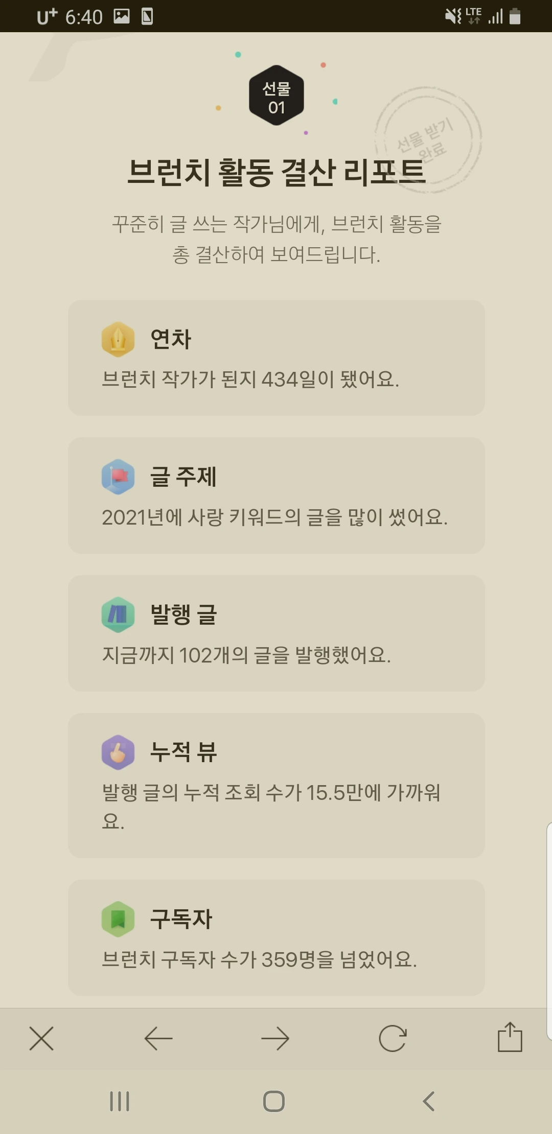 브런치 팀이 보내준 결산 리포트는 내가 2년 동안 내가 활동했던 부분을 보기 쉽게 정리해서 보내줬다. 브런치 팀의 정성을 느낄 수 있었다.