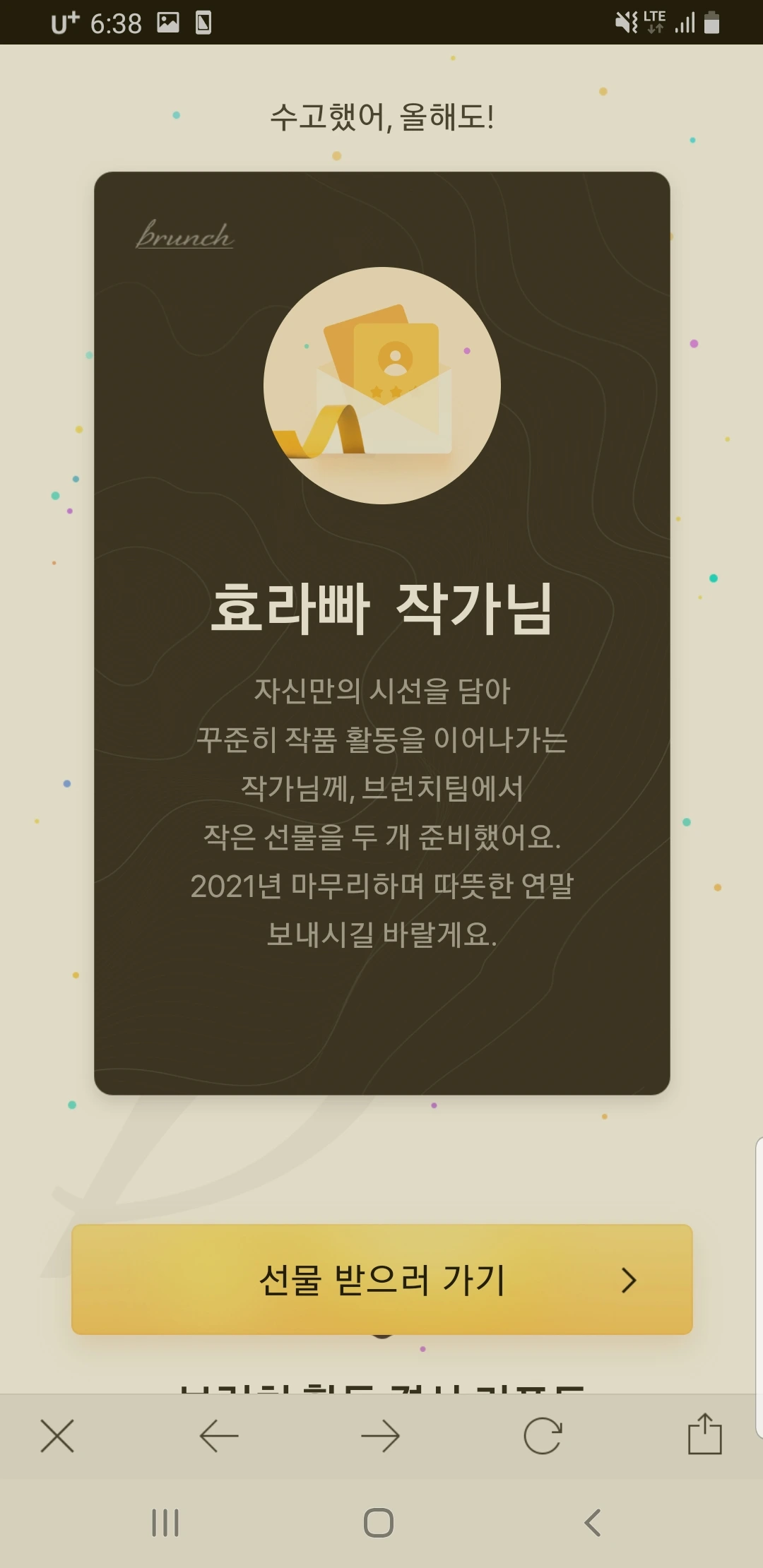 올 한 해는 브런치를 통해서 많은 성과를 얻었다. 아직 책은 안 나왔지만 브런치 작가라면 누구나 갖고 싶어 하는 내 책을 조만간 가질 수 있을 거 같고, 좋은 작가 분들과 소통할 수 있었던 점은 정말 브런치가 아니면 할 수 없는 일인 거 같다. 브런치에 정말 감사하다는 말을 전하고 싶다.