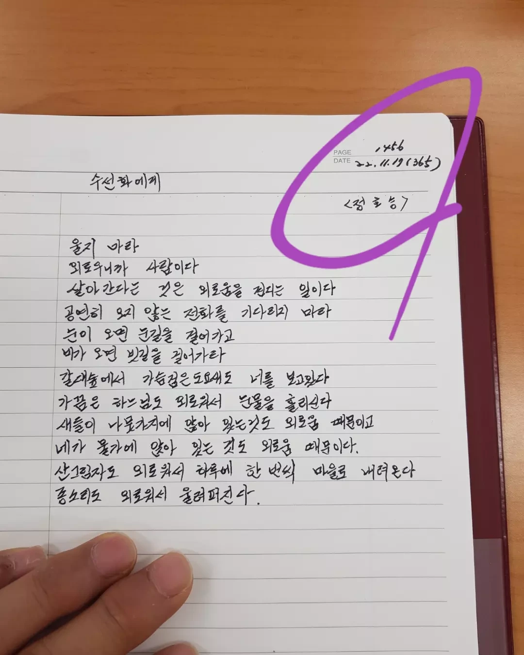찬 바람이 불어오던 1년 전 시 필사를 시작했다. 처음엔 하루에 10편을 했다. 적지 않은 분량이었다. 시를 느끼는 것이 아니라 단순히 시를 옮겨 적고 있다는 것을 알았다. 계획을 바꿔 하루 5편을 했다. 시간적인 여유가 생기고 내가 의도했던 대로 시를 감상할 수 있는 여유가 생겼다. 지금은 소설을 쓰느라 하루에 3편씩 필사하고 있다. 분량은 적어졌지만 시에 더 깊게 다가갈 수 있는 거 같다.