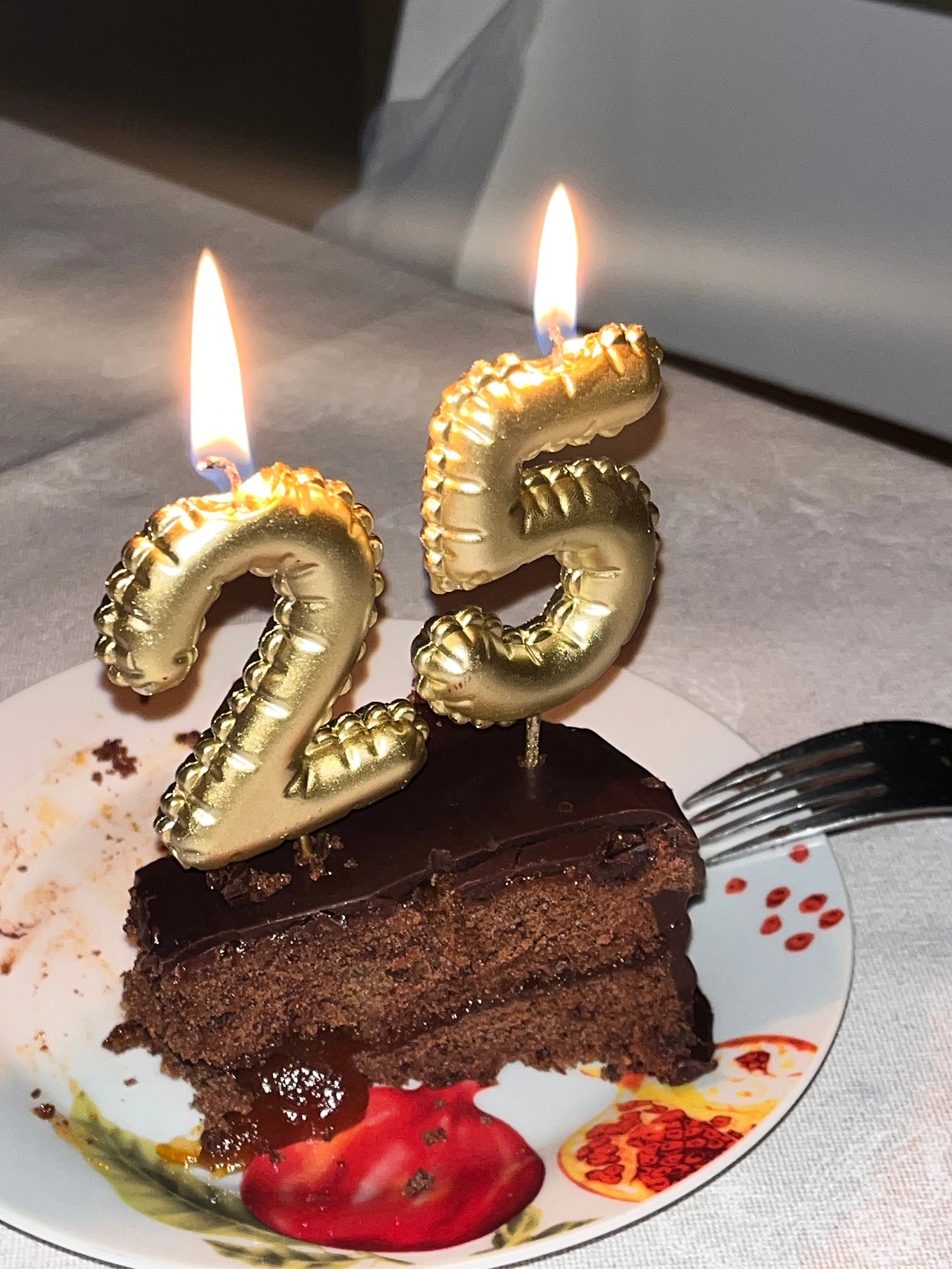 근처 빵집에서 초콜릿 케이크 한 조각과 작은 숫자 초 '2'와 '5'를 샀다.