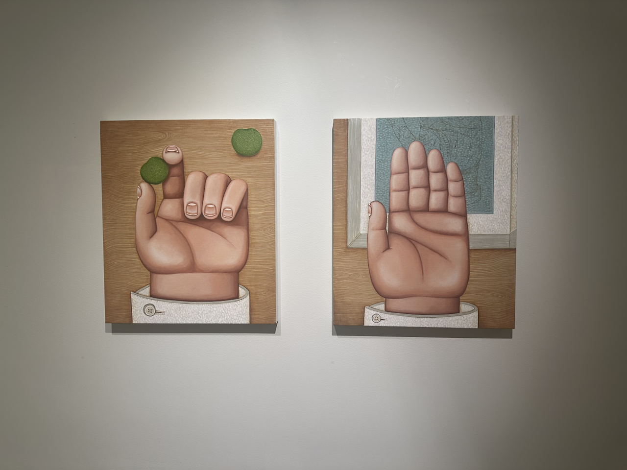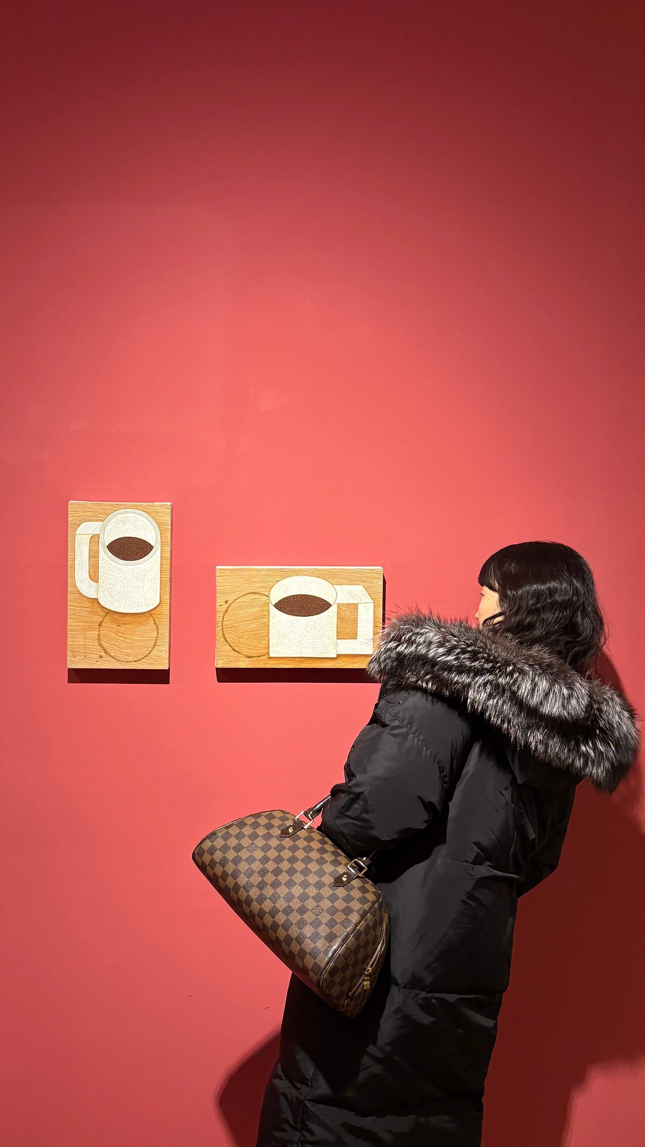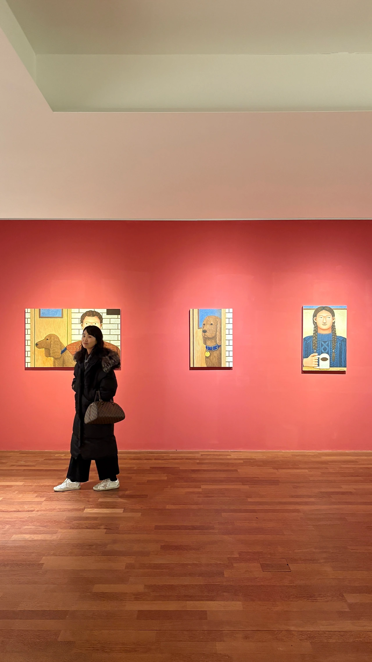 이번 전시는 아기자기함에서 벗어난 작가님의 색다른 면을 볼 수 있어 감회가 새로웠다. 무표정의 사람과 동물이 등장하는 방식도 특색 있게 다가왔다. 어떤 작품이 제일 마음에 드냐는 친구의 물음에 빨간 벽에 걸린 작품들을 골랐더니 친구가 예쁜 사진도 한 장 남겨줬다.