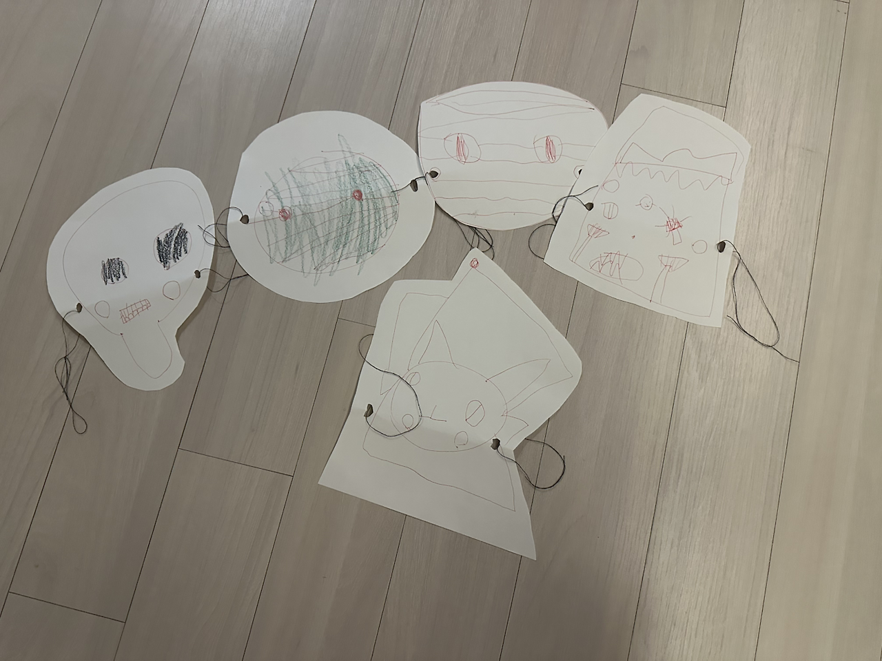 말이 끝나기가 무섭게 아이는 그림을 빠르게 쓱싹쓱싹 다섯 개나 그렸다. 어떤 건 귀엽고, 어떤 건 무섭고, 심지어 웃긴 것도 있다. 아이가 그림으로 자신의 생각을 표현하는 능력이 놀라울 정도로 급성장하고 있다는 사실이 감사하다. 잘 그리고 못 그리고의 판단은 접어두고 아이랑 같이 제일 무서운 가면을 골라본다. 아이가 무섭다고 생각하며 그린 가면에 구멍을 내고 실을 넣어서 쓸 수 있게 만들어주는 것도 내 역할이다.
