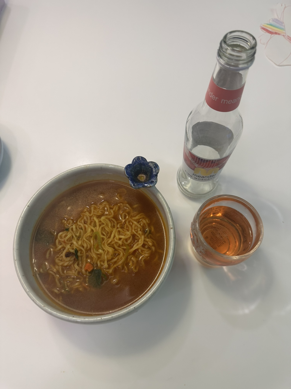 저녁에 부추전, 라면과 함께 미니와인을 마시니 방전됐던 에너지가 다시 채워지는 느낌이었다. 기분이 더 나아졌으면 하는 마음으로 내가 좋아하는 꽃모양 그릇에 라면을 담았더니 보고만 있어도 기분이 좋아진다.