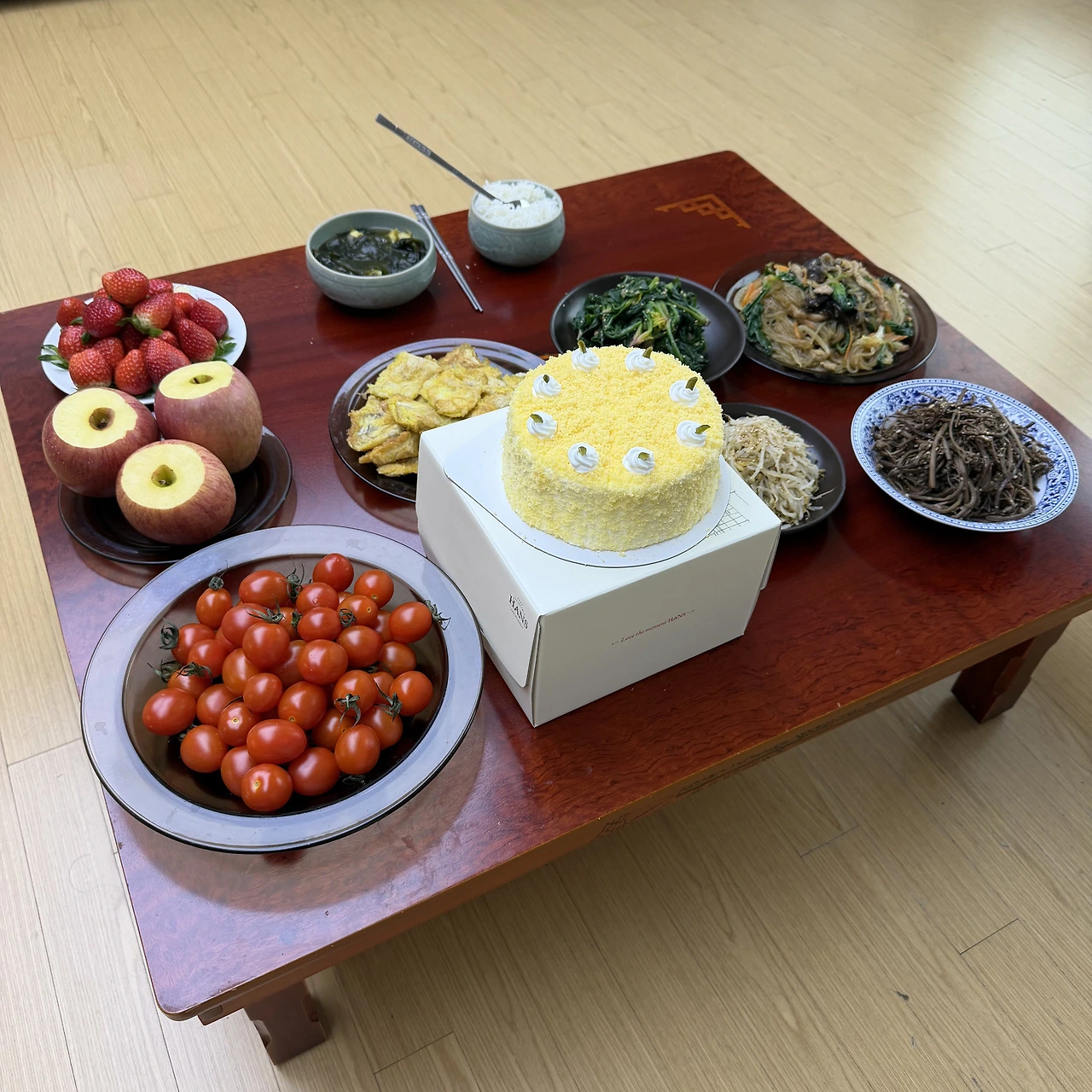 "조금만 준비할게" 하셨지만 우리 엄마는 손이 크신 분. 엄청나게 많은 양의 음식을 준비할 거라는 걸 알고 있었다. 미역국에 나물, 전, 아빠가 좋아했던 잡채까지! 과일 역시 보기만해고 싱싱하고 예쁜 것들로 정성스레 준비하셨다. 나는 달랑 케이크 하나만 사가지고 갔는데....