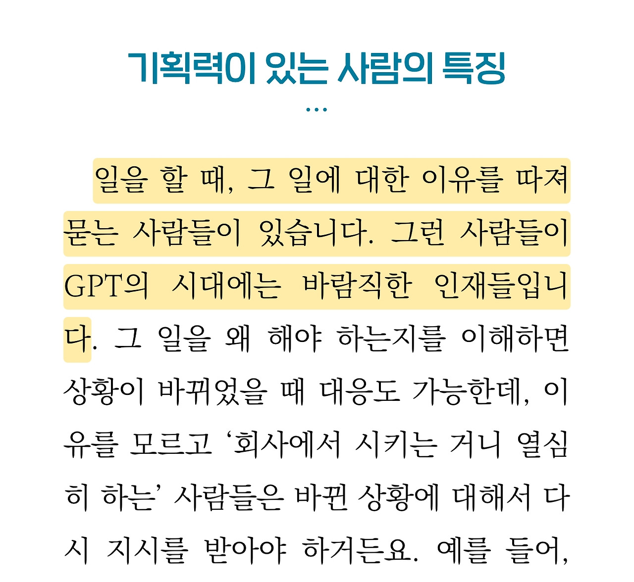 앞으로는 글쓰기를 하면서 Chat GPT의 도움도 잘 받을 수 있도록 늘 “왜”에 대해 고민하면서 기획력과 구성력도 기르고 싶다. 이시한 작가님이 <GPT 제너레이션>에서 GPT 시대에 인재가 되는 사람은 “이유”를 따져 묻는 사람이라고 했으니까:)