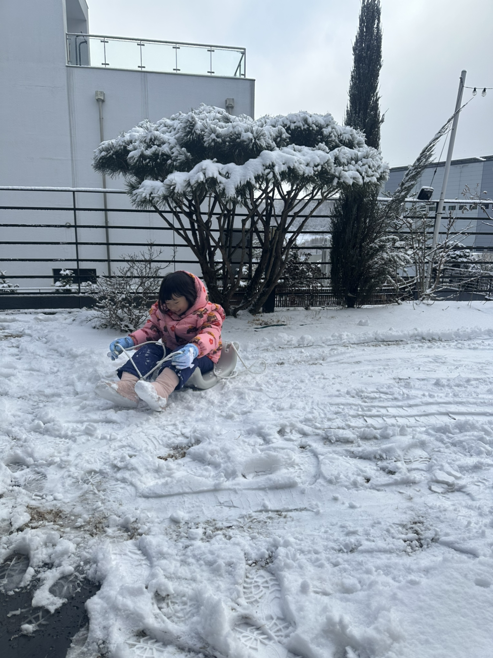 내친김에 아이가 좋아하겠지 싶어 생애 최초로 썰매도 끌어줬다. “엄마 더 빨리“를 외치는 아이 기대에 부흥하고 싶어 힘을 내보지만 저질 체력이라 10번이 한계. ”엄마 한 번만 더~! 제발~~~~“ 까르르 웃으며 신나 하는 아이의 간절함에 부흥하고자 한 번만 더 힘을 내본다. 진정한 엄마파워.