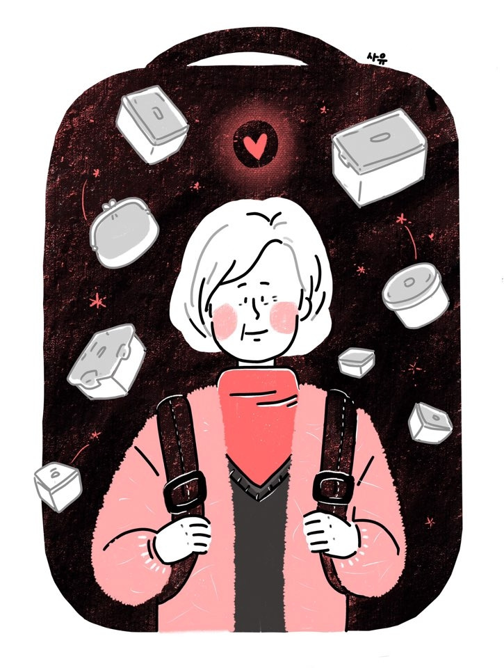 내가 중학교 때 멘 검은색 백팩인데 몸집이 커버린 뒤로는 메지 않았다. 사실은 다른 브랜드 가방이 갖고 싶었다. 이 가방은 어느샌가 엄마의 출퇴근길을 함께하고 있다. 엄마는 오히려 몸집이 작아지는지 그 가방이 작아 보이지 않는다. 아침에는 여기에 시금치를 담아 가고 오후에는 시금치 무침을 담아 온다. 엄마가 일하는 곳에는 전기 레인지가 있어서 점심에 밥을 지어 먹고 반찬도 만든다고 한다. 한가득 반찬을 만들어오는 날이면 꼭 반찬통을 꺼내 보여준다. “너 좋아하는 거”라면서.