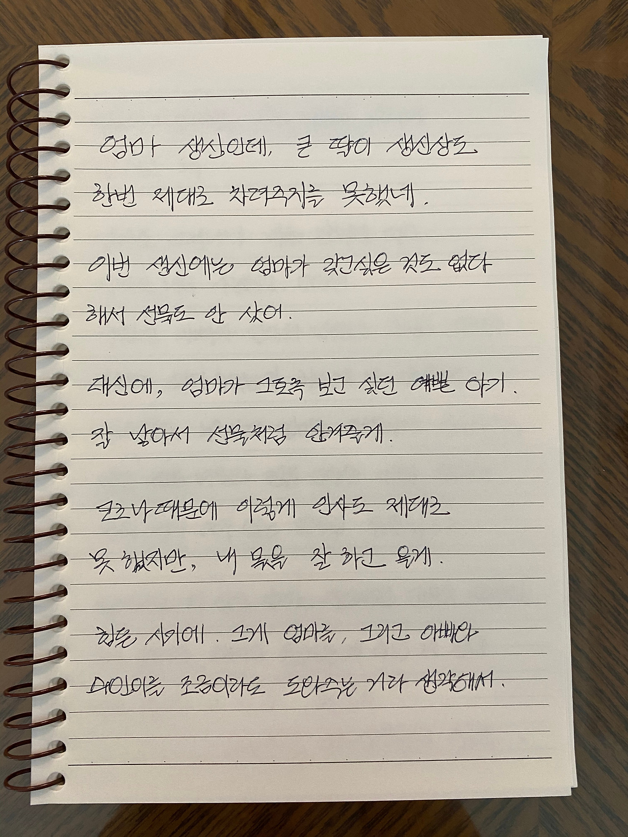 엄마. 내일 생신인데 큰 딸이 생신상도 한 번 제대로 차려주지를 못했네. 이번 생신에는 엄마가 갖고 싶은 것도 없다고 해서 선물도 안 샀어.