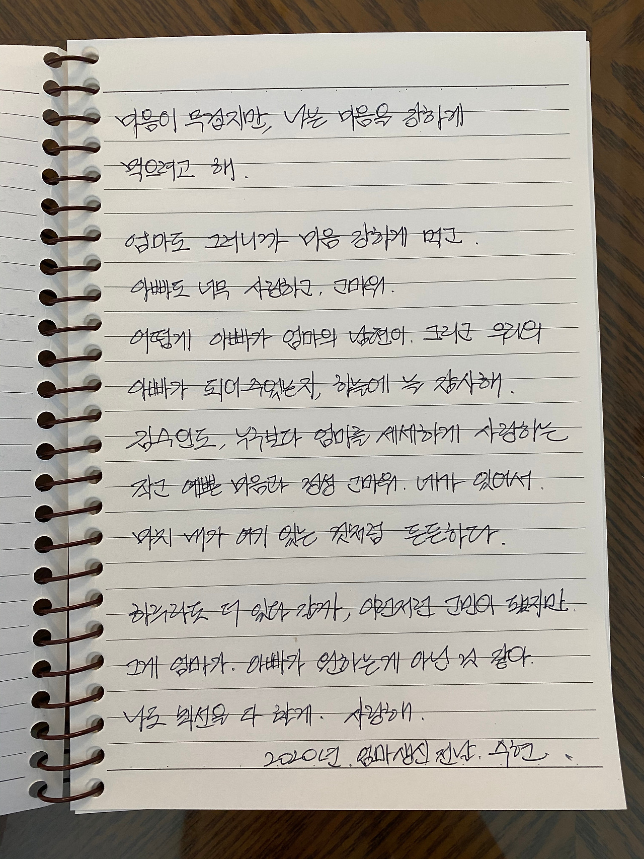 아빠도 너무 사랑하고 고마워. 어떻게 아빠가 엄마의 남편이, 그리고 우리의 아빠가 되어 주었는지 하늘에 늘 감사해. 수인이도 누구보다 엄마를 세심하게 챙겨주는 정성, 너무나 고마워. 네가 엄마 곁에 있어서 든든하다.