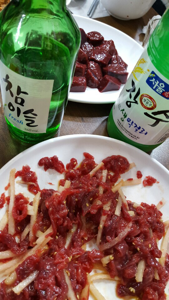 저녁. 넷이서 광장시장 '형제육회집' 옆 한산한 가게에서 육회와 간을 안주로 '참이슬 후레시' 1병과 '장수막걸리' 2병을 마셨다.