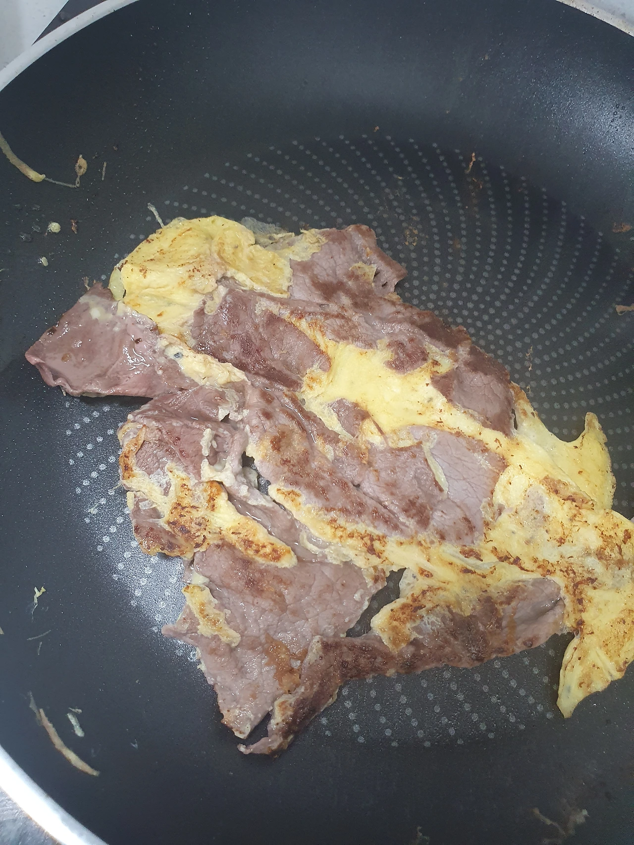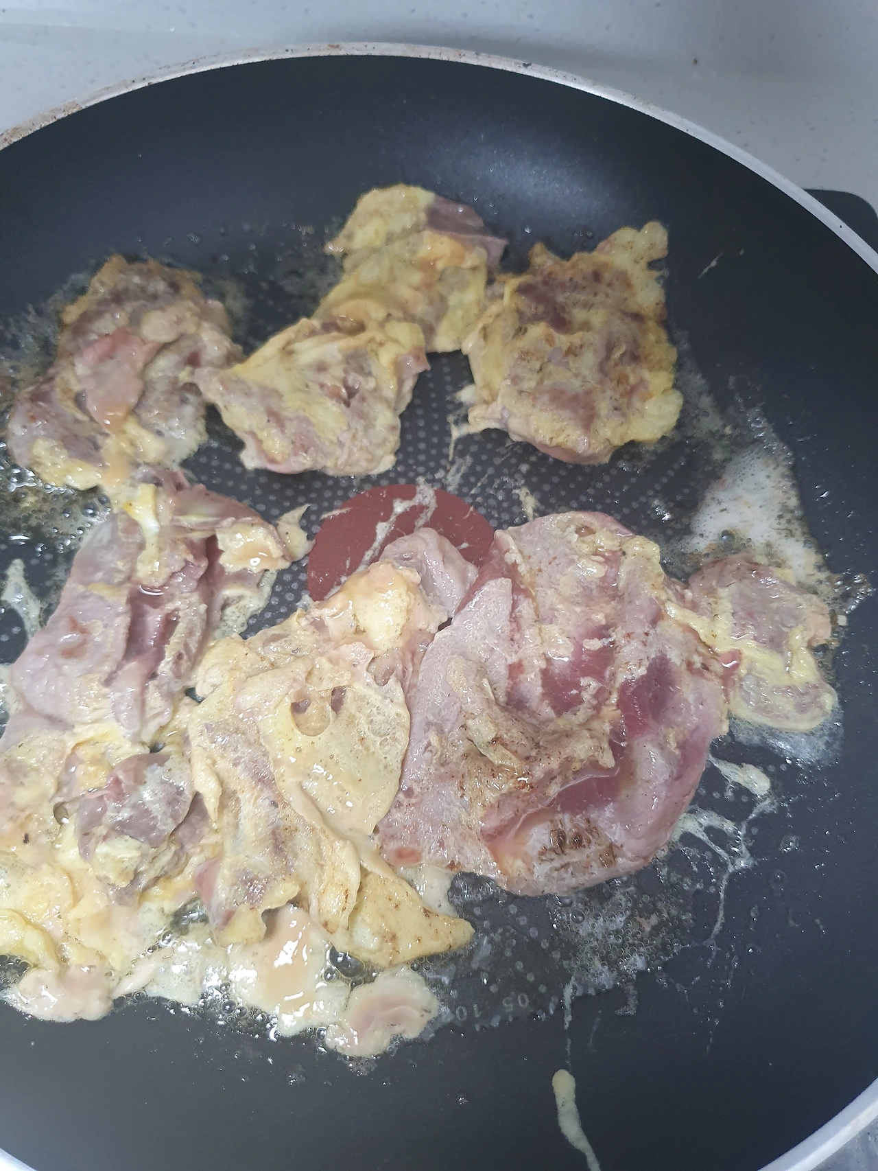 3. 계란을 입힌 설도를 프라이팬에 넣고 굽는다.