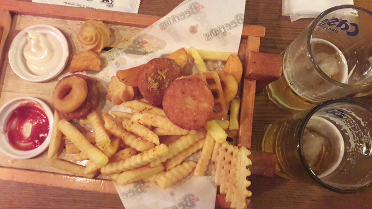 '사민주의의 주스' 500ml 2잔을 마셨다. 안주로는 감자튀김을 시켰다. 새우깡을 시키려했으나 시키지 못했다. 단품메뉴이기 때문에 다른 걸 먼저 시켜야 한다는 종업원의 설명. 원래는 안 그러지 않았냐고 따지자 정책이 바뀌었단다. 알바는 죄가 없다. 미안해 하는 표정이 안쓰러웠다.