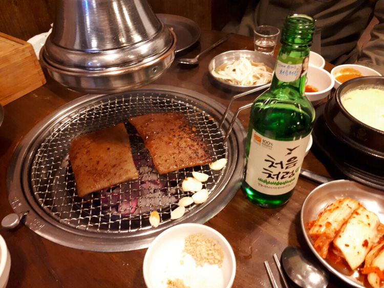 '껍데기' 2인분을 시켰다. 양념 돼있는 것 하나와 양념 안 돼있는 것 하나. '처음처럼' 2병을 마셨다.