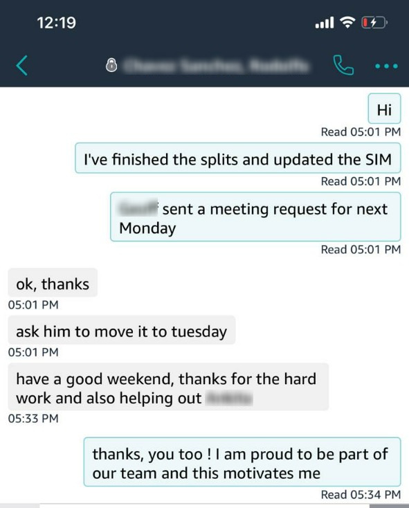 물론, 본인이 관리자급이라면 근무 시간 이외에 팀원이 일하지 않도록 장려함으로써 팀원들의 내재적 동기 부여를 해치는 것을 예방할 수 있습니다. 서두에 예를 들었던 필자의 친구 사례로 돌아가 보자면, 그러한 상황에서 일을 함에도 불구하고 그 친구는 불편한 기색을 내보이지 않고 오히려 즐겁게 일하는 모습을 볼 수 있었습니다. 친구에게 그 이유가 무엇인지 묻자, 그 친구는 아래와 같이 본인 팀장과 대화한 메신저를 보여주었습니다.