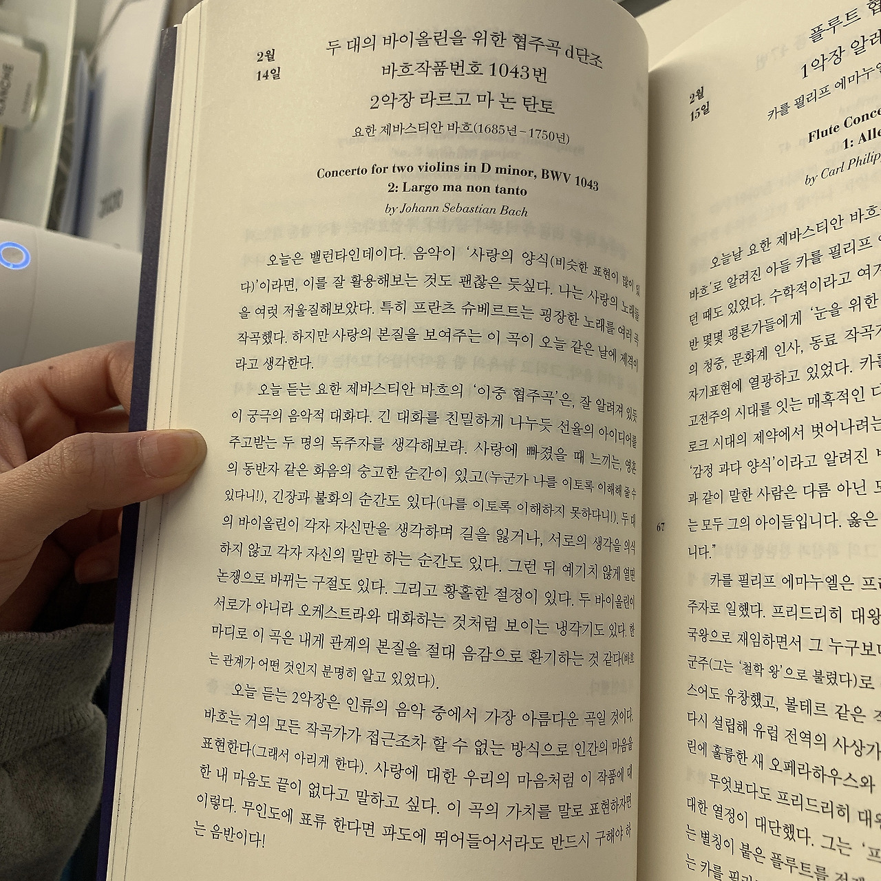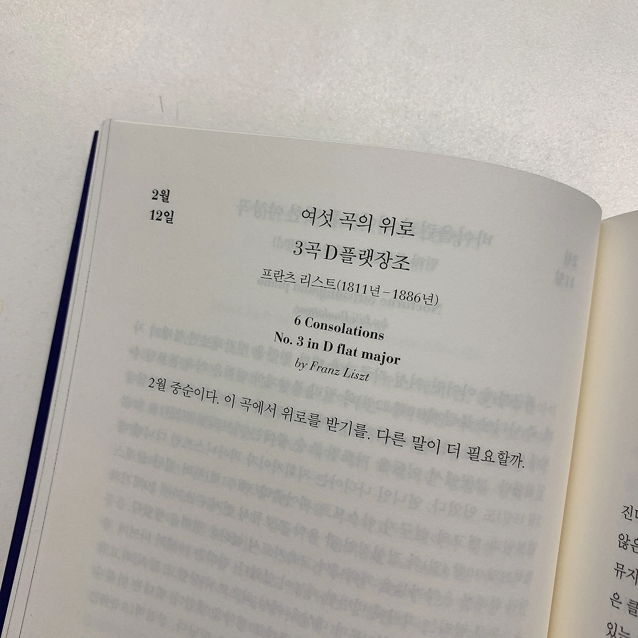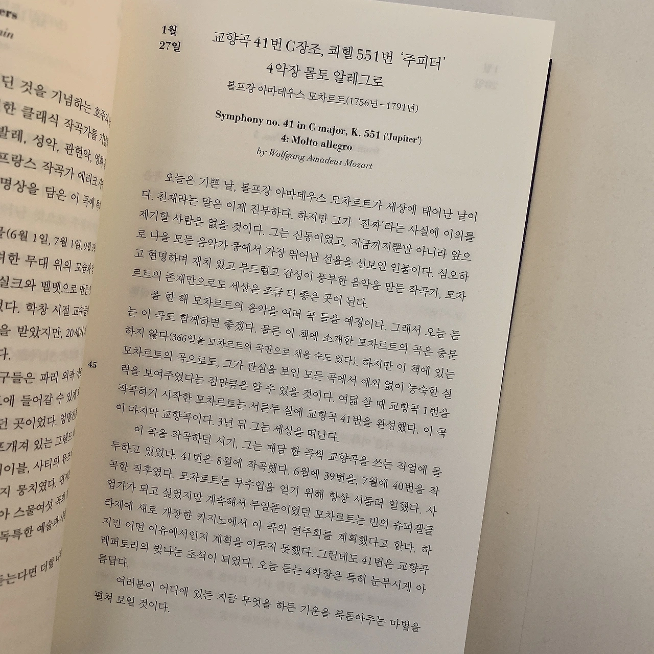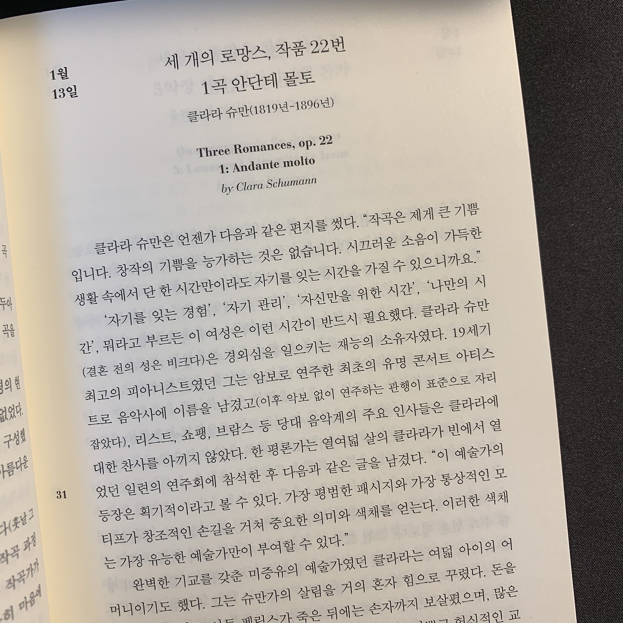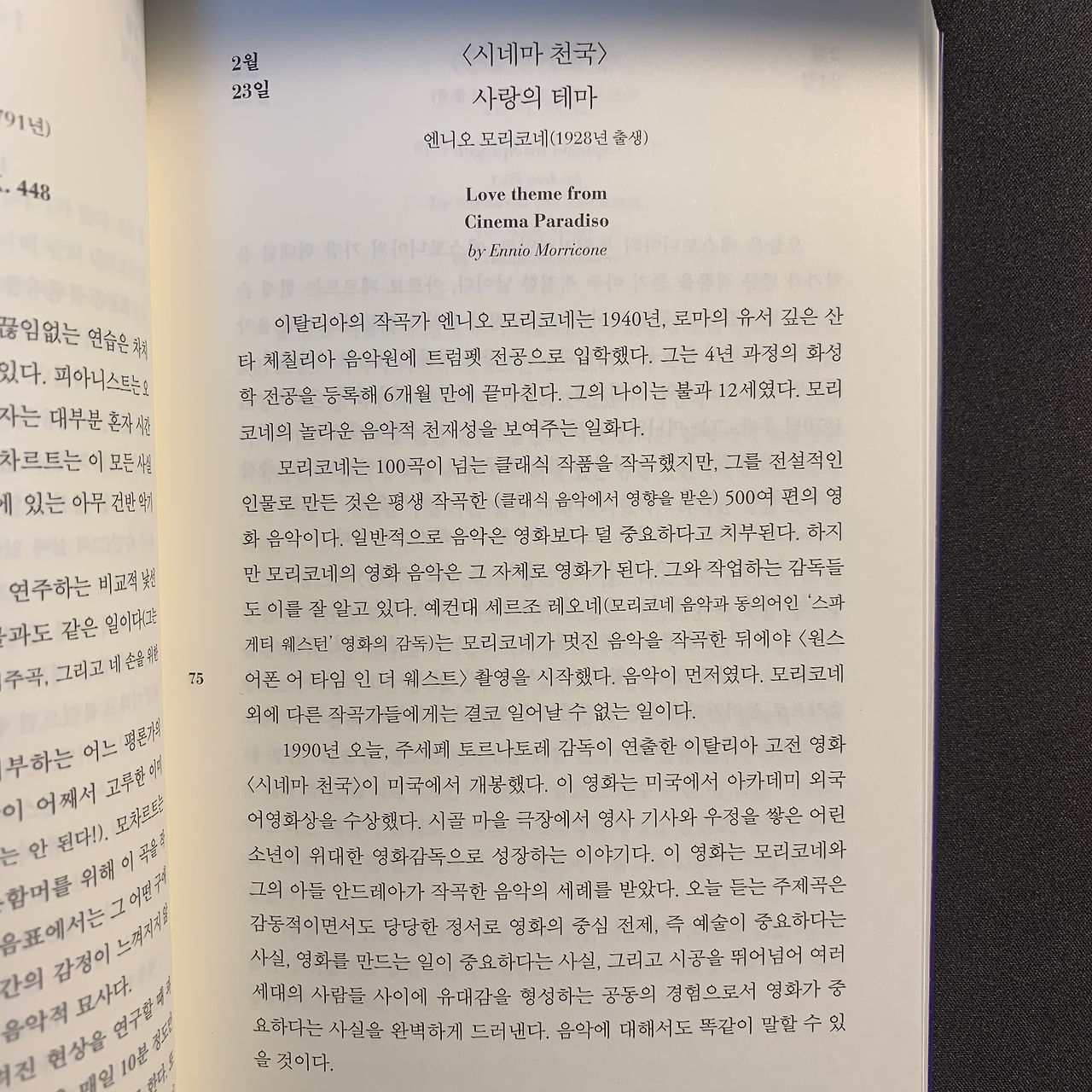그래서 이 책은 특별하다. 하루에 한 곡씩. 고전부터 현대까지, 속성으로 소개해주기 때문이다. 시간 순으로 나열되어 있지 않기 때문에 공부하는 느낌이 들지 않아 더 자유롭게 독서할 수 있으며, 책 속에서 연계되는 곡들은 친절하게 소개되어 있기 때문에 사전처럼 이리저리 옮겨다니며 읽기도 좋다. 한 곡에 얽힌 이야기들을 풀어나가다 보면 천일야화와 같은 이야기를 듣고 있는 듯한 기분이 든다.