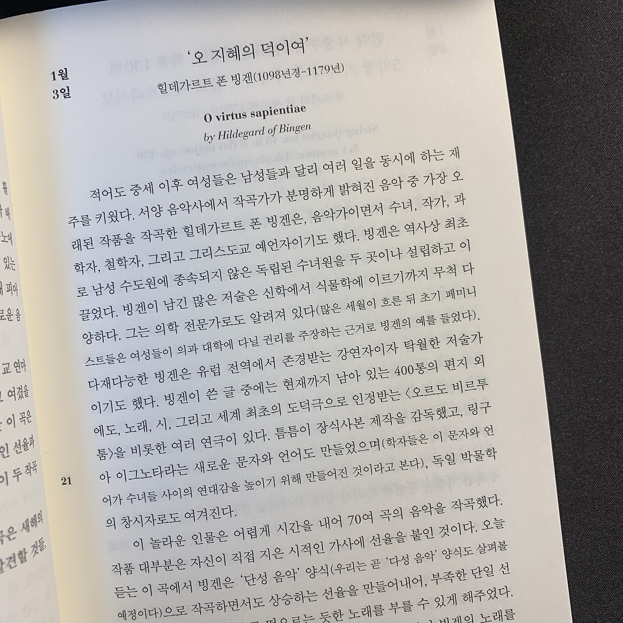 또한 개인적으로는 근현대 작곡가인 타나카 카렌, 막스 리히터, 도브린카 타바코바, 존 케이지, 에릭 사티, 하워드 구달, 앤절라 몰리, 샐리 비미시, 구스타프 말러, 구스타브 홀스트, 스티브 라이히, 제임스 맥밀런 등의 이야기도 실려 있어서 공부가 되었다. 사실 근현대음악보다는 클래식음악을 더 좋아해서 편향적으로 골라 들었던 지난날들을 반성하는 시간이 되기도 했다.