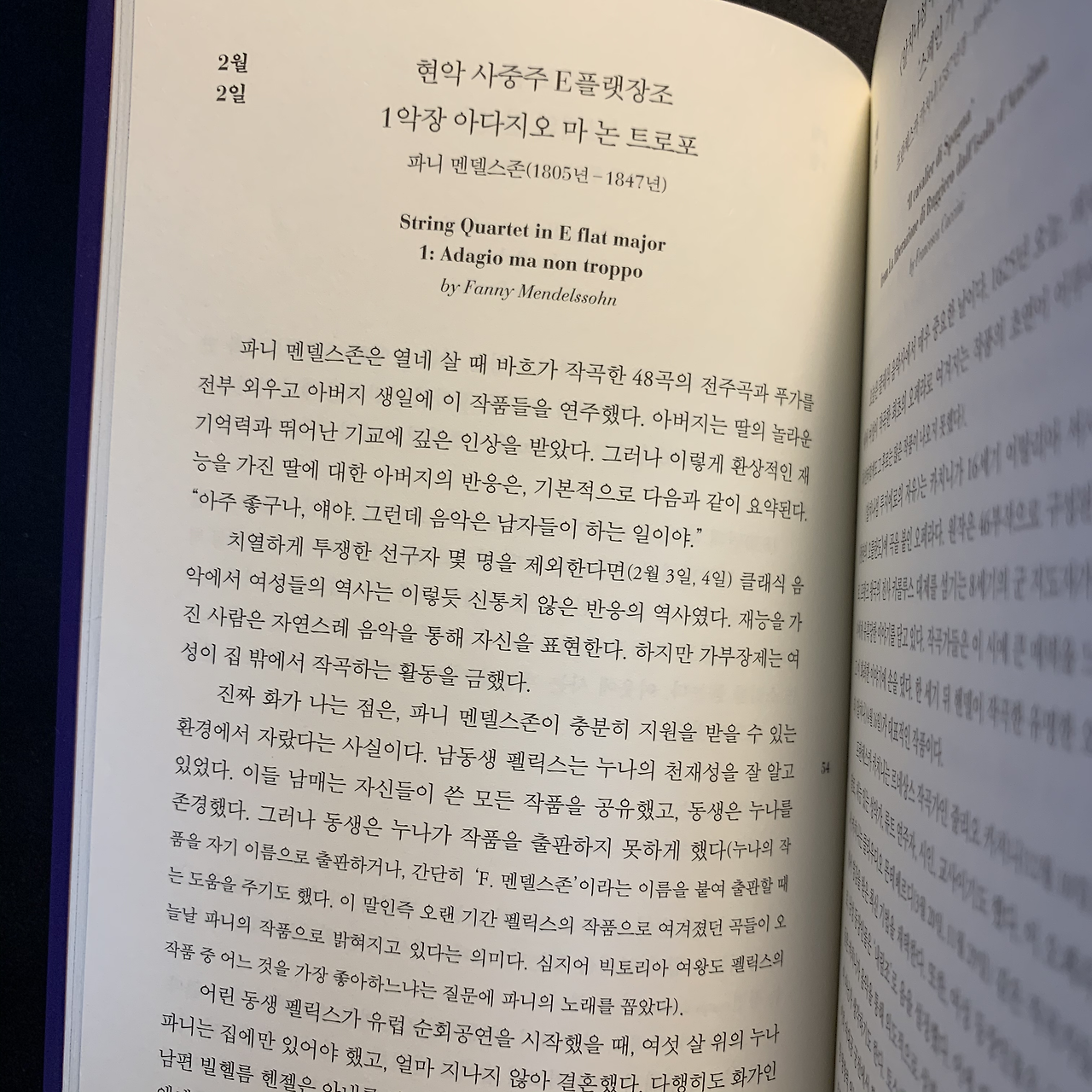 책을 읽는 동안, 나도 같은 여자로서 '아 클래식 음악에 이런 여성의 역사가 있었구나'하며 뜻깊게 읽을 수 있었다. 지금이야 음악에 남녀가 없지만, 고전시대서부터 시작된 클래식 음악의 역사에는 여성이 늘 그림자에 가려져 있었고, 작가는 그것을 늘 안타깝게 생각하는 듯 했다.