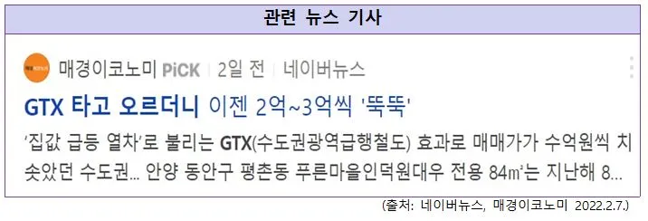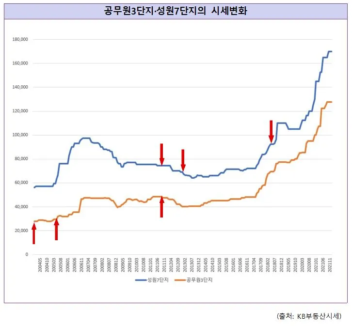 그래프의 화살표가 나타내는 부분은 각각 호재가 인식, 진행, 완료되는 시점을 순서대로 표시한 것입니다. 어떤 부분에서는 가격이 상승하기도 하고, 어떤 부분에서는 하락하기도 합니다. 아울러 두 아파트의 시세 변화를 살펴보면, 호재가 적용되는 시점의 차이가 있음에도 불구하고 상당히 유사한 흐름을 보여주고 있습니다. 교통 호재가 아파트 시세에 눈에 띄는 긍정적인 영향을 주었다고 말하기는 어려워 보입니다.