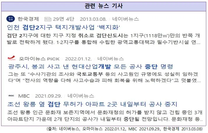 사람들이 부동산 매수를 고려할 정도로 좋아할 만한 호재는 무엇일까요? 생활의 여건이 눈에 띄게 좋아지는 주거·교통 환경 개선과 같은 대형 개발일 것입니다. 버스 노선이 몇 개 추가되거나 주변에 병원 하나가 들어온다고 해서 부동산을 사지는 않겠죠. 가격을 이끌어줄 수요를 불러오는 호재는 그 규모가 크기 때문에 굉장히 많은 비용과 시간이 필요합니다. 개발에서 비용이나 시간이 많이 소모된다는 것은 불확실성이 커짐을 의미합니다. 대형 규모의 개발은 재원마련, 개발이익 검토 등에서 이해관계가 복잡하여 갑자기 착공 전 사업의 방향이 틀어지거나 예상치 못한 사고 등으로 취소되기도 하며, 준공 시점도 예상부터 10년 이상을 바라보며 예정보다 연기되는 경우도 많습니다. 결국은 호재가 확실한 상승 요인이 될 수는 없는 것입니다.