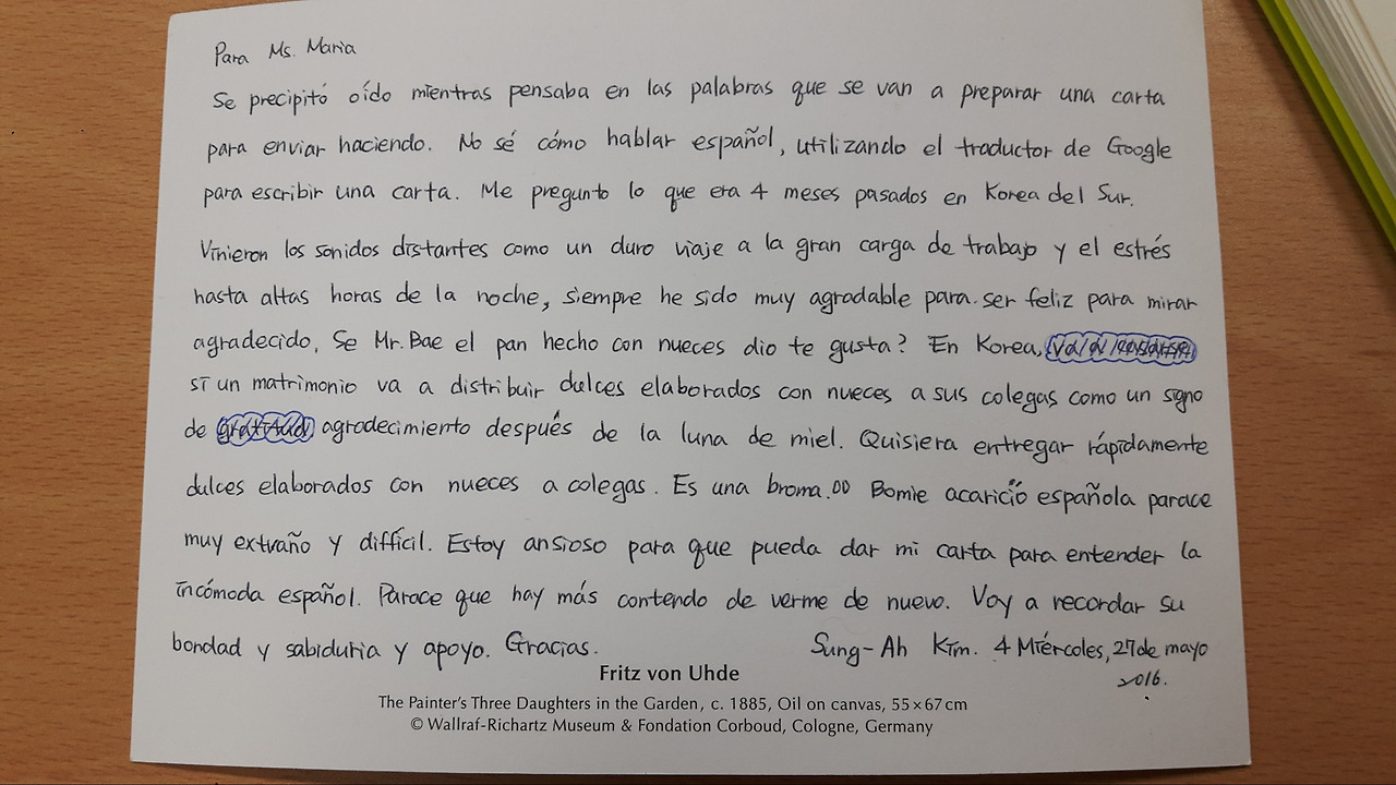 프로젝트가 끝나고, 마리아 언니가 스페인으로 돌아가기 전날 스페인어로 번역하여 썼던 편지를 올려본다.