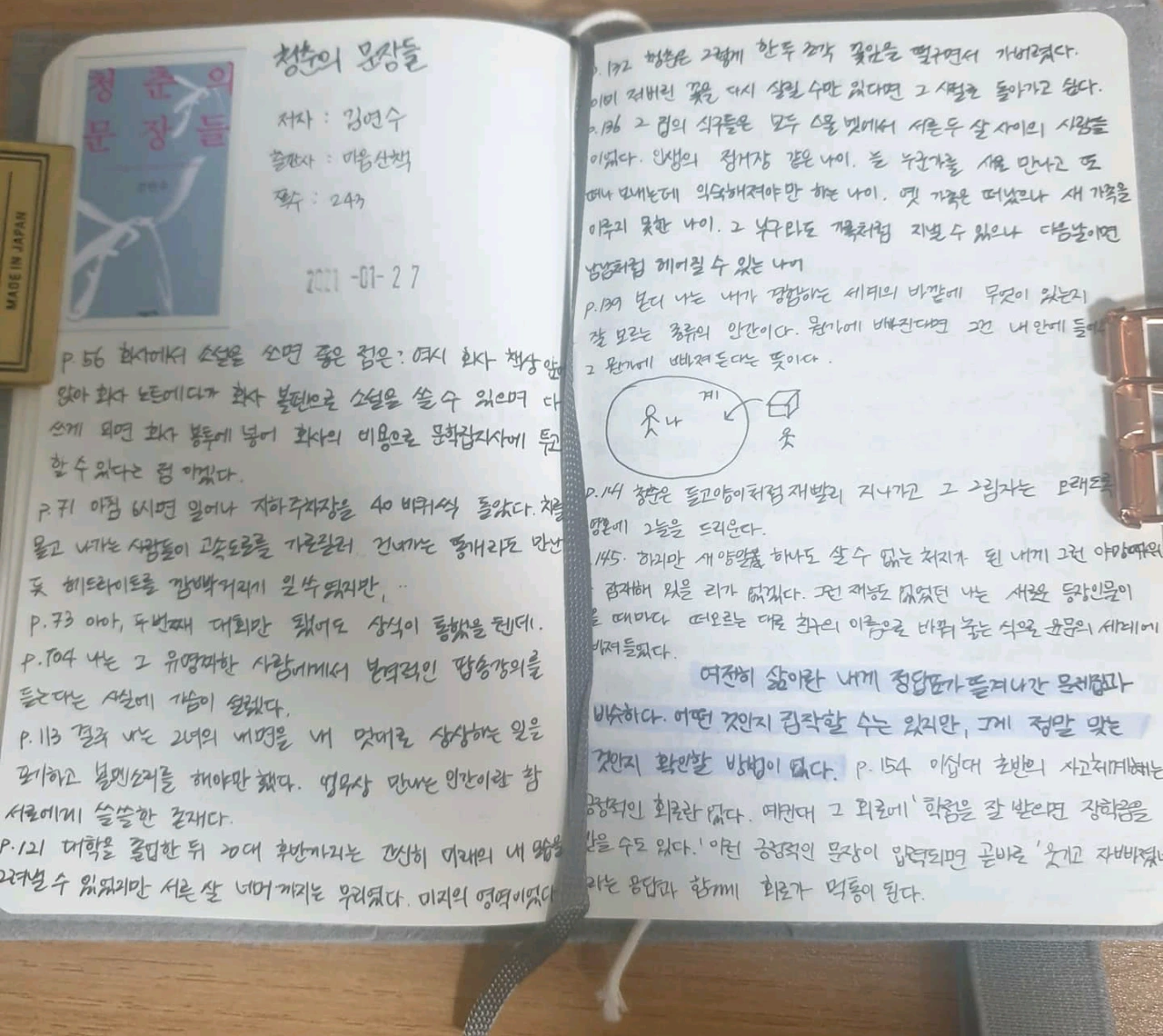 필사노트는 재작년까지 A5 20공 바인더에 하다가 휴대성을 고려해 몰스킨노트로 바꿨다. 각기 장단점이 있는데 관련해 제작해 본 영상은 아래 링크를 참조하시라. (구독과 좋아요는 사랑이여요.)