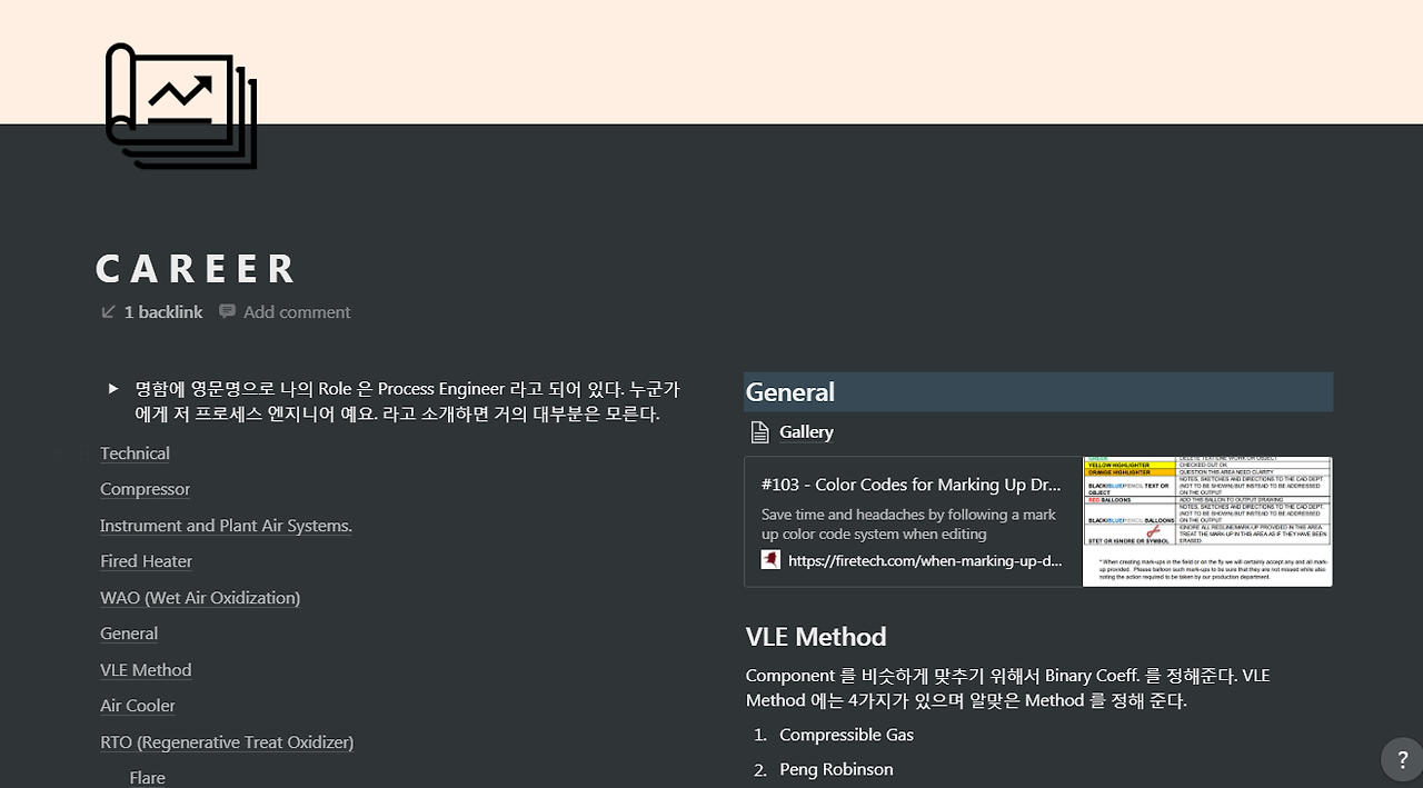 성실하게 기록하는 습관은 내 분야에서 누구도 범접할 수 없도록 스스로 진입장벽을 높이는 몸값 올리기의 지름길이요. 내공을 중무장한 한 권의 포트폴리오를 완성한다. 상사와의 트러블이 있었을 때 지혜롭게 대처한 이야기 같은 것도 적어둔다. 어차피 나만 보는 공간이기 때문에 자유롭다. 내 노션 페이지에 들어간 내용은 아래와 같다.
