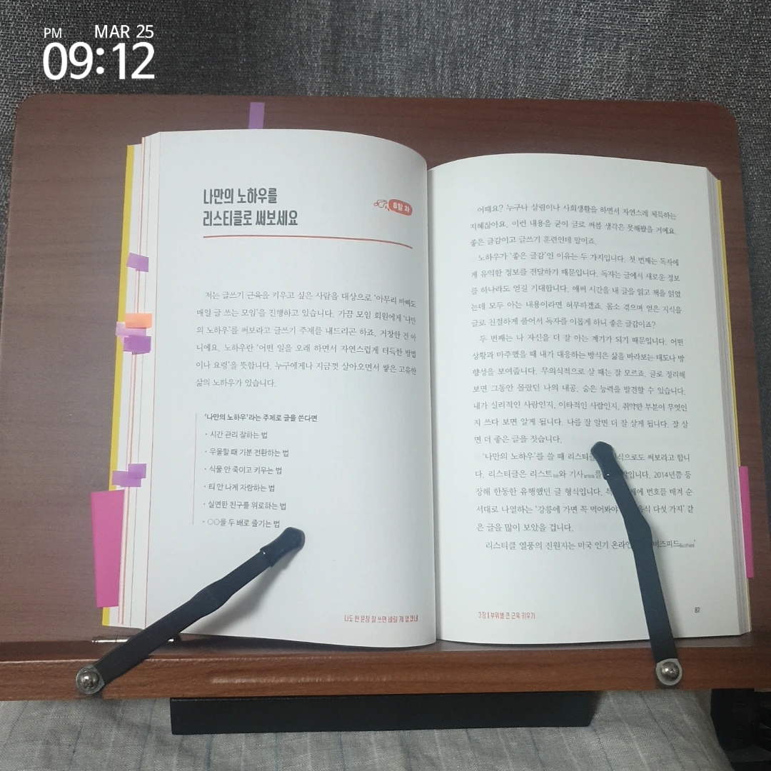 노트에 필사 할 문장은 해당 문장 책 옆구리를 쭉 따라가 가로로 인덱스지를 붙인다. 생각을 확장해 콘텐츠로 활용할 만하다 싶은 문장은 책 윗구리(?)를 쭉 따라가 세로로 붙여 구분한다.