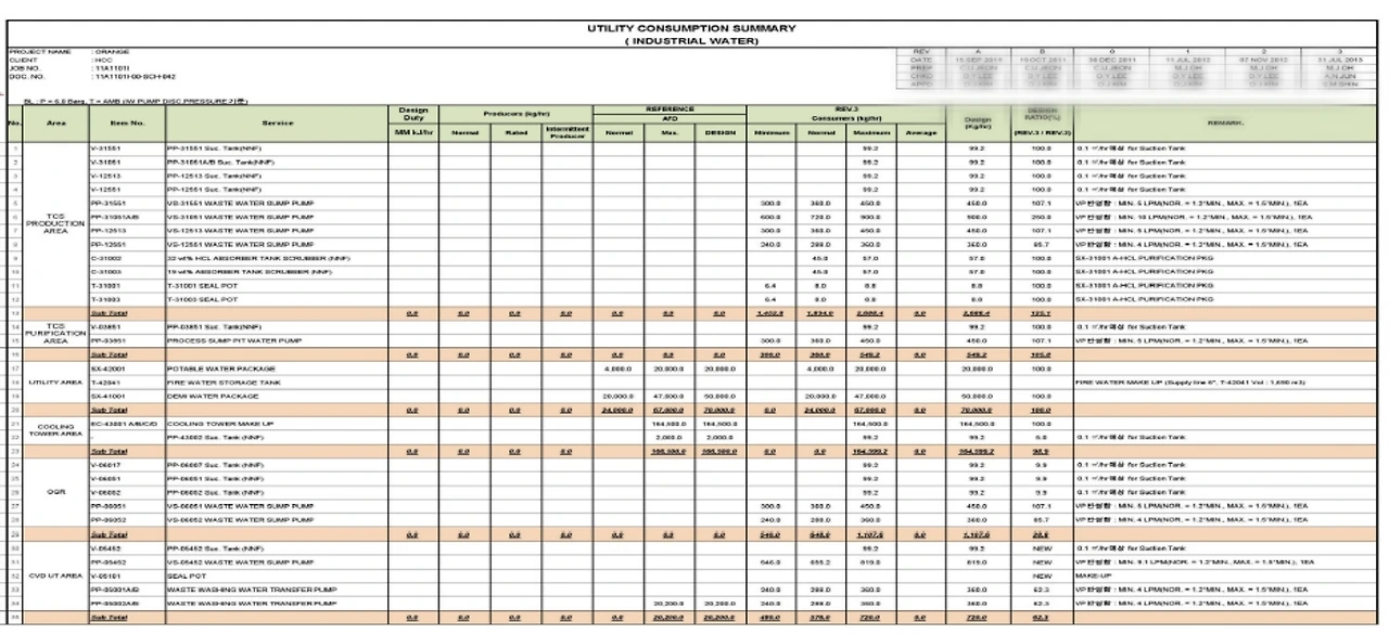예시 : Utility Consumption Summary공정 설계 엔지니어가 작성하는 문서 중 '유틸리티 서머리'라는 문서가 있다. 공장에서 사용하는 물이나 공기 혹은 가스 등의 사용량을 더하거나 빼서 "In - Out = 0" 이 되도록 하는 문서다.